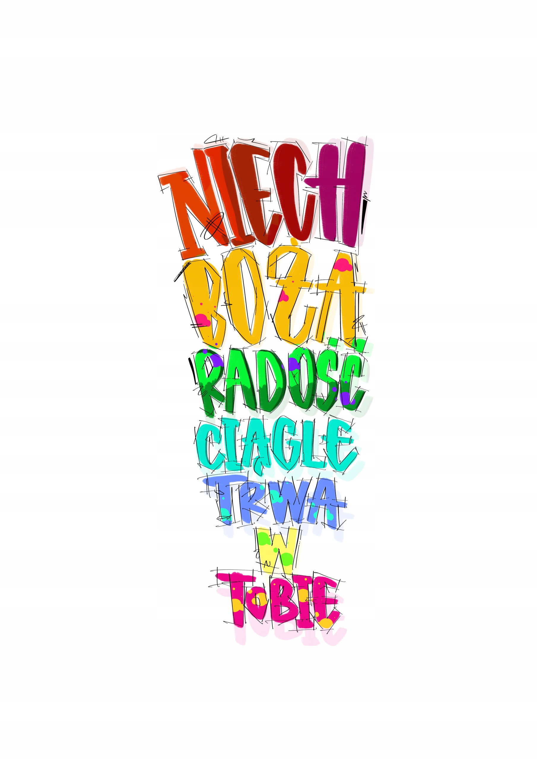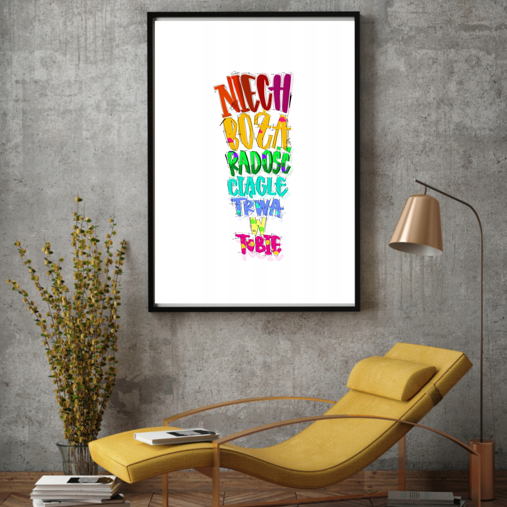Idealny jako prezent na każda okazję. Treść plakatu stanowią słowa: "Niech Boża radość ciągle trwa w tobie", zapisane w kolorowej, bogatej wersji.