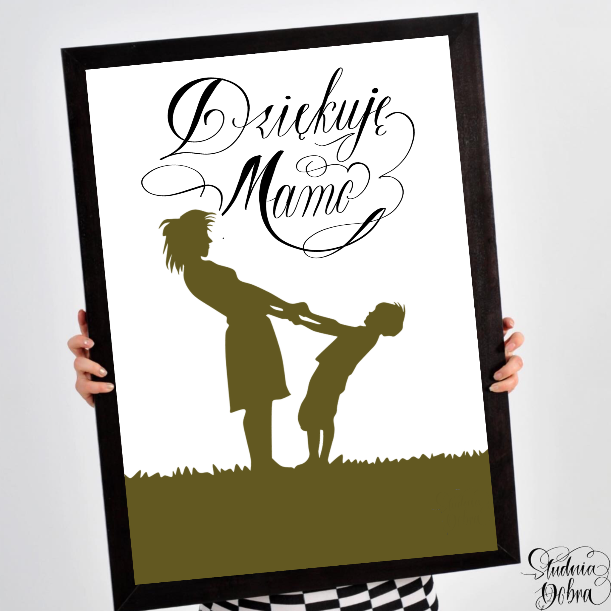 Idealny jako prezent na Dzień Mamy. Przedstawia słowa "Dziękuję Mamo", napisane w ozdobnej, nowoczesnej formie oraz grafikę.