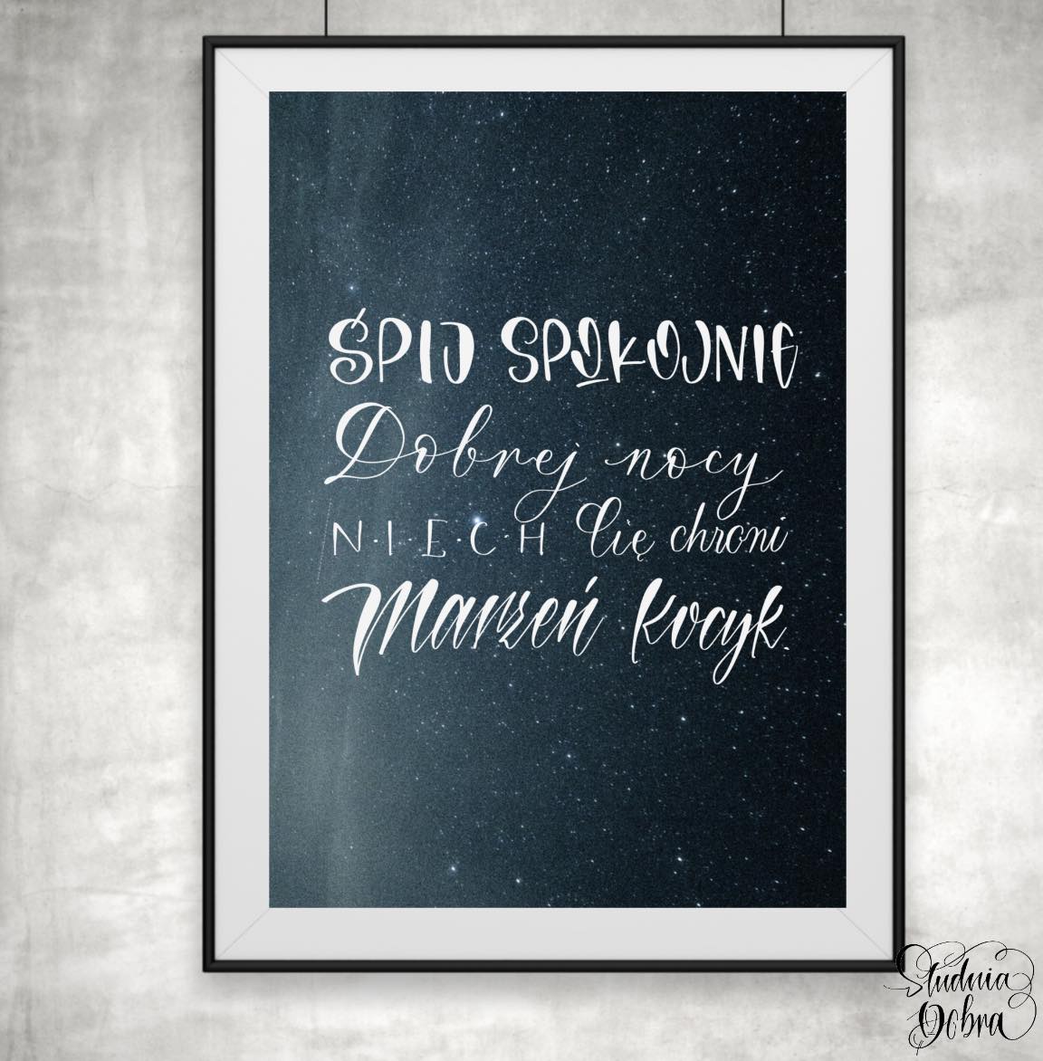 Idealny jako prezent na rózne okazje. Tekst: Śpij spokojnie, dobrej nocy. Niech Cię chroni marzeń kocyk" napisany ozdobnym pismem na tle gwieździstego nieba.