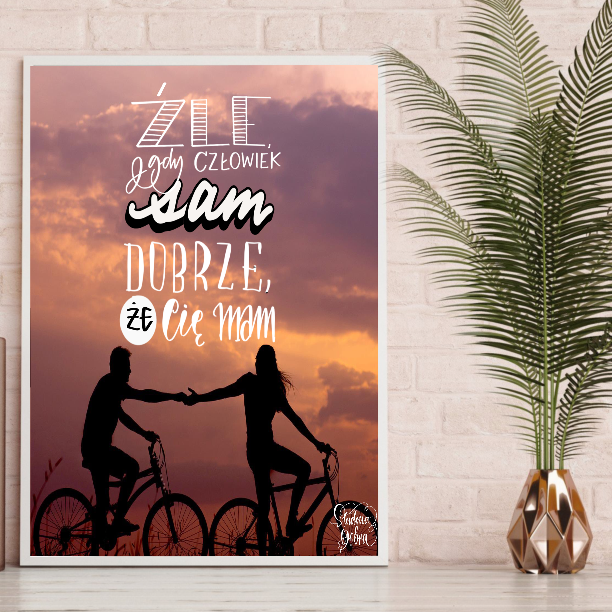 Idealny jako prezent na rózne okazje. Przedstawia słowa "Źle, gdy człowiek sam. Dobrze, że Cię mam.", napisane w ozdobnej, nowoczesnej formie wraz z przeznaczona grafiką.