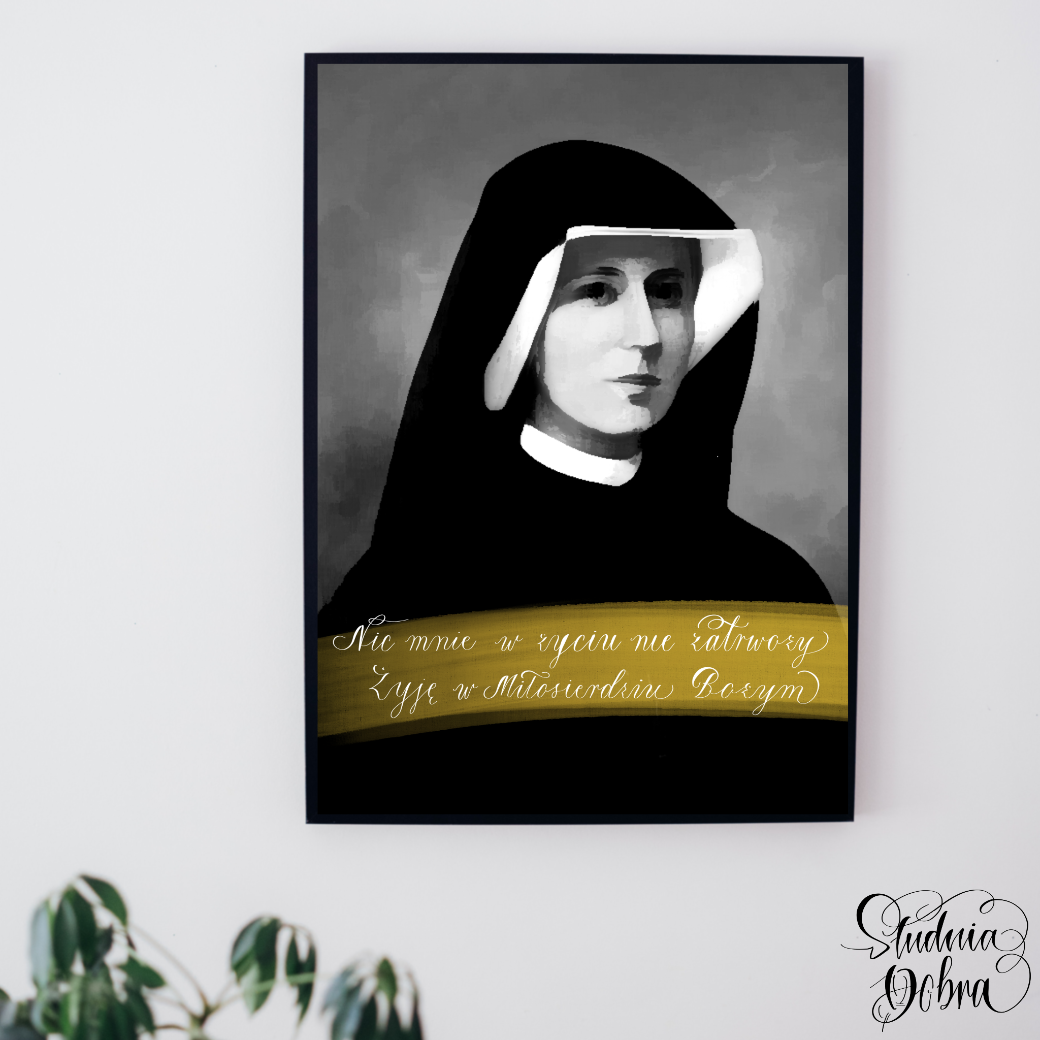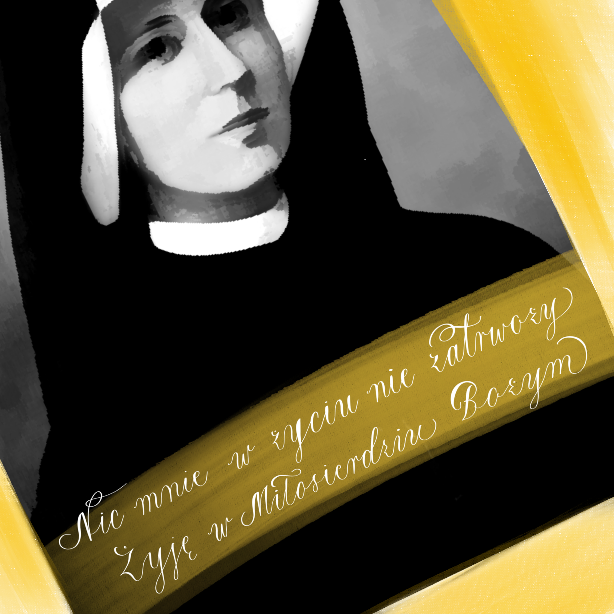 Przedstawia wizerunek św. Siostry Faustyny Kowalskiej wraz z cytatem: Nic mnie w życiu już nie trwoży. Żyję w Miłosierdziu Bożym", napisany w ozdobnej, nowoczesnej formie.