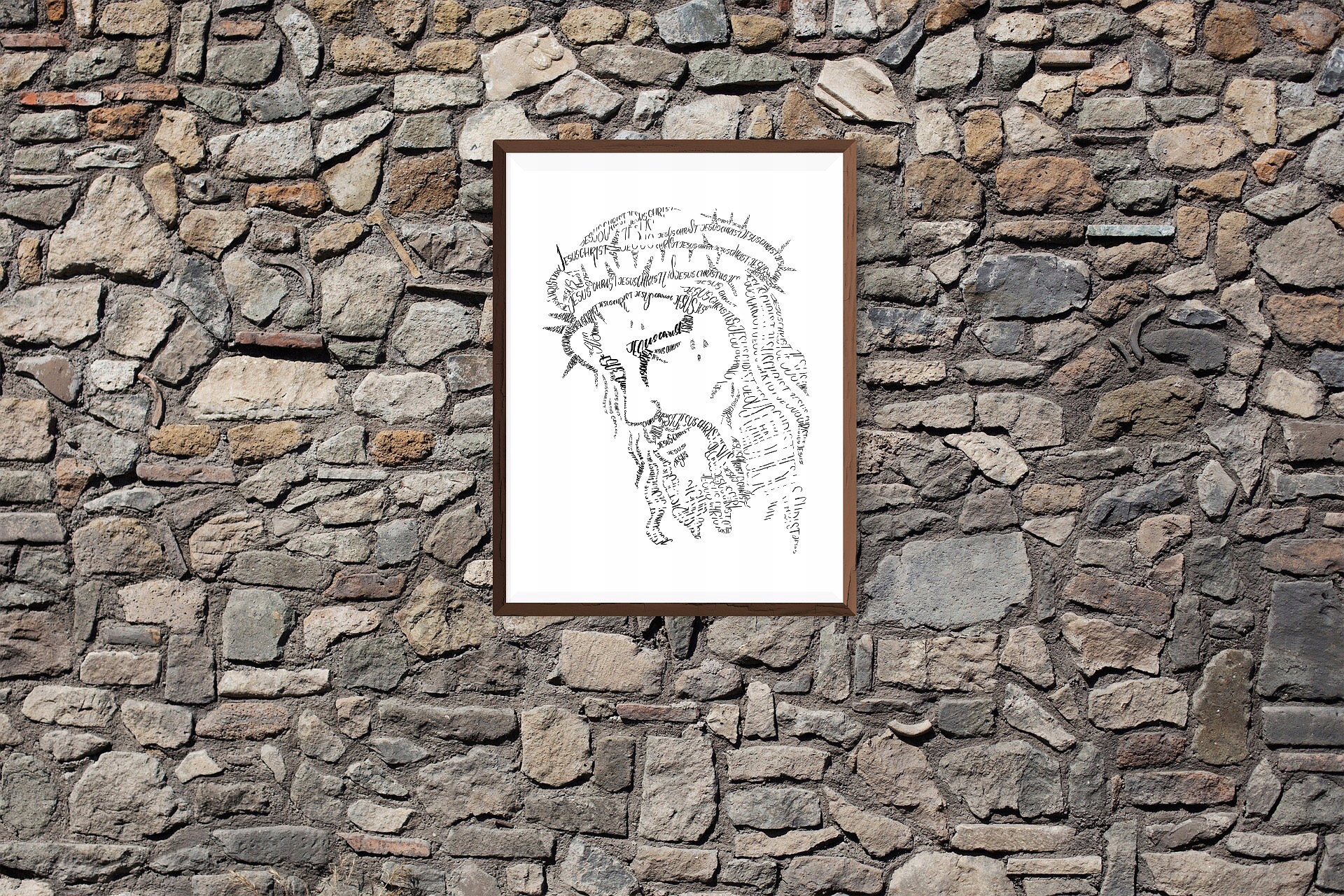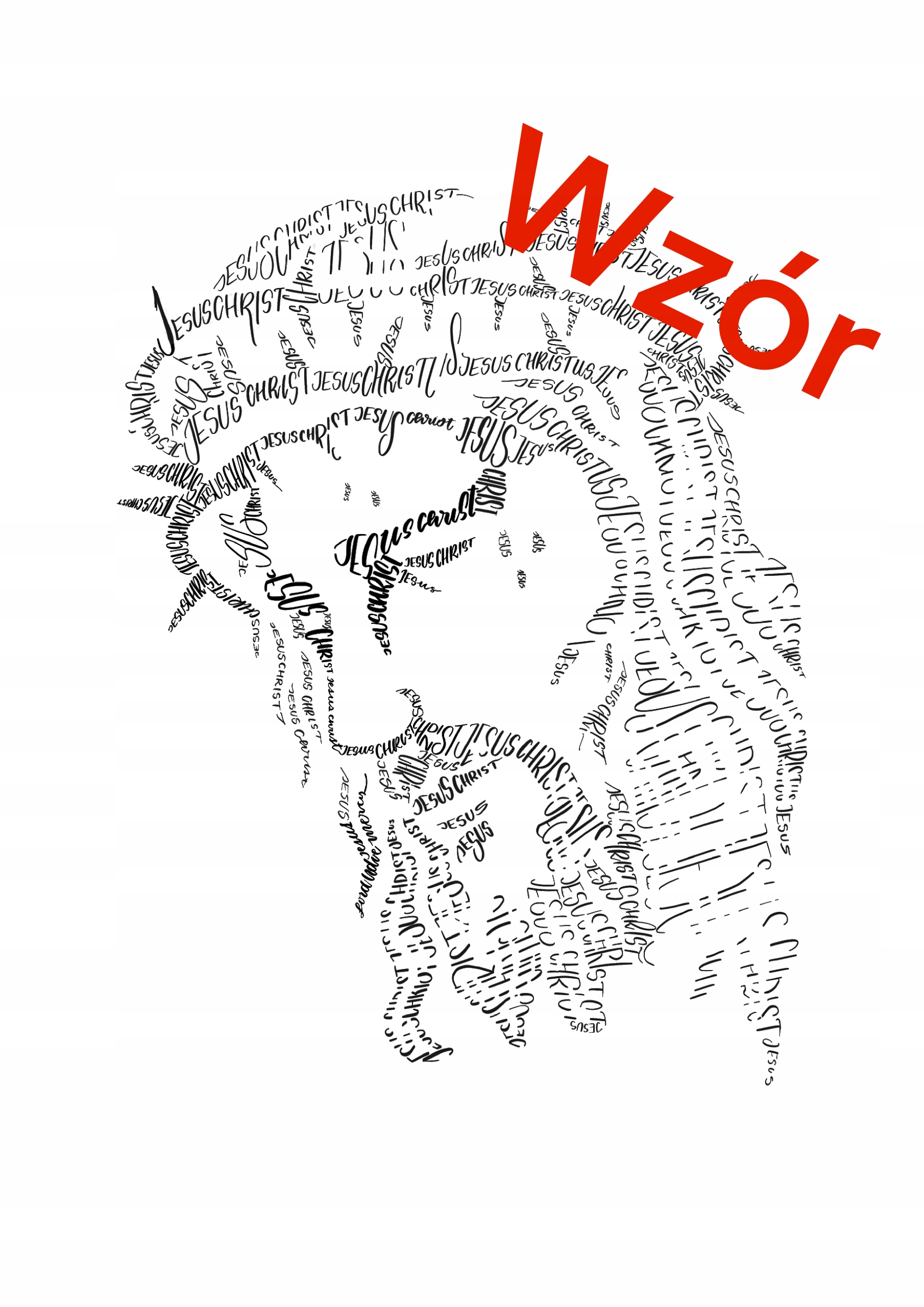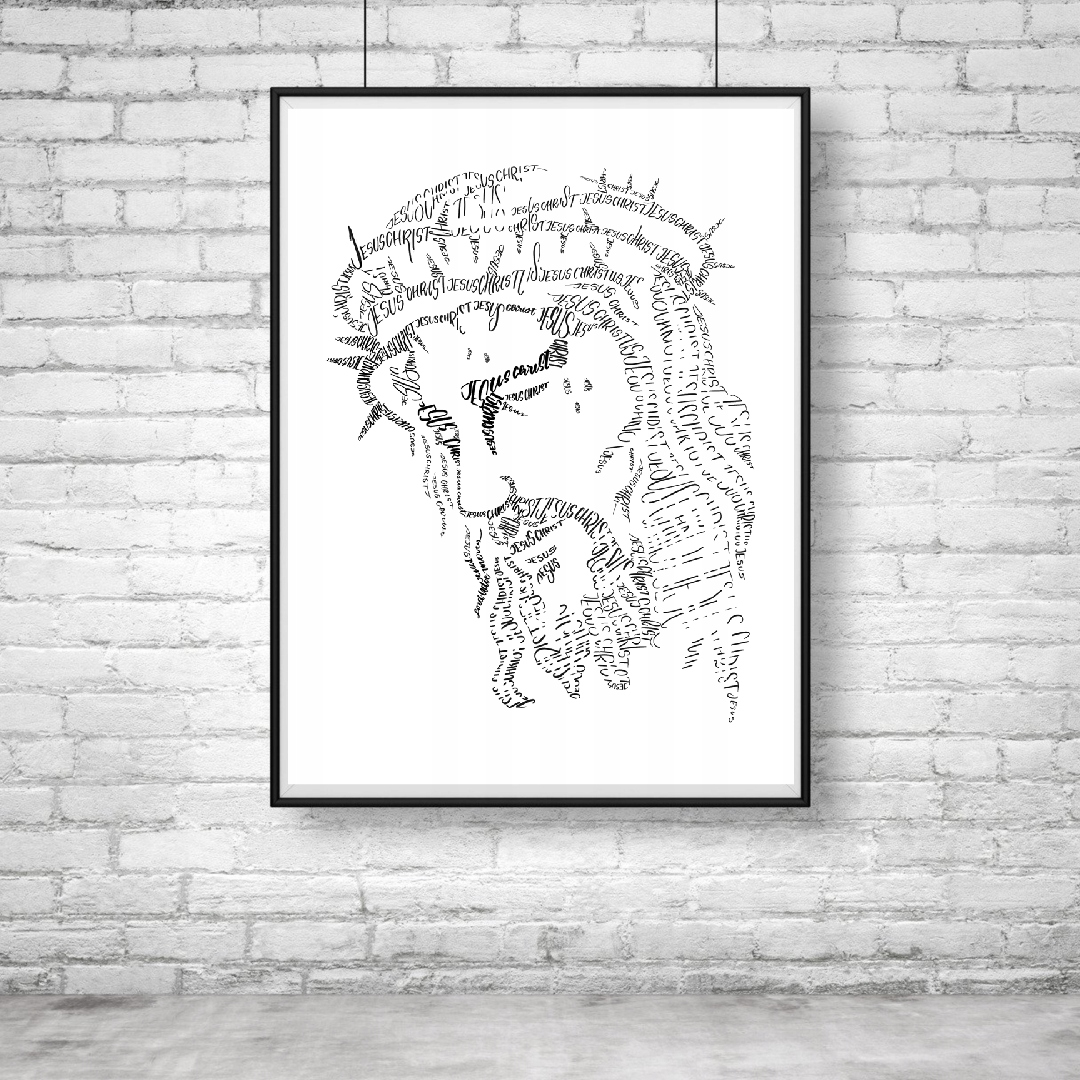 Idealny jako prezent na każda okazję. Plakat przedstawia wizerunek Jezusa Chrystusa w koronie cierniowej, który skład się z napisu "Jesus Christ". Grafika zapisana jest ozdobnym pismem.