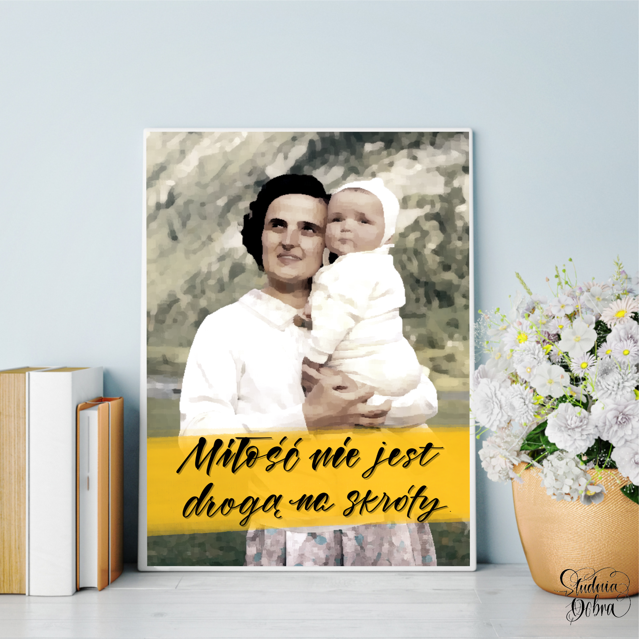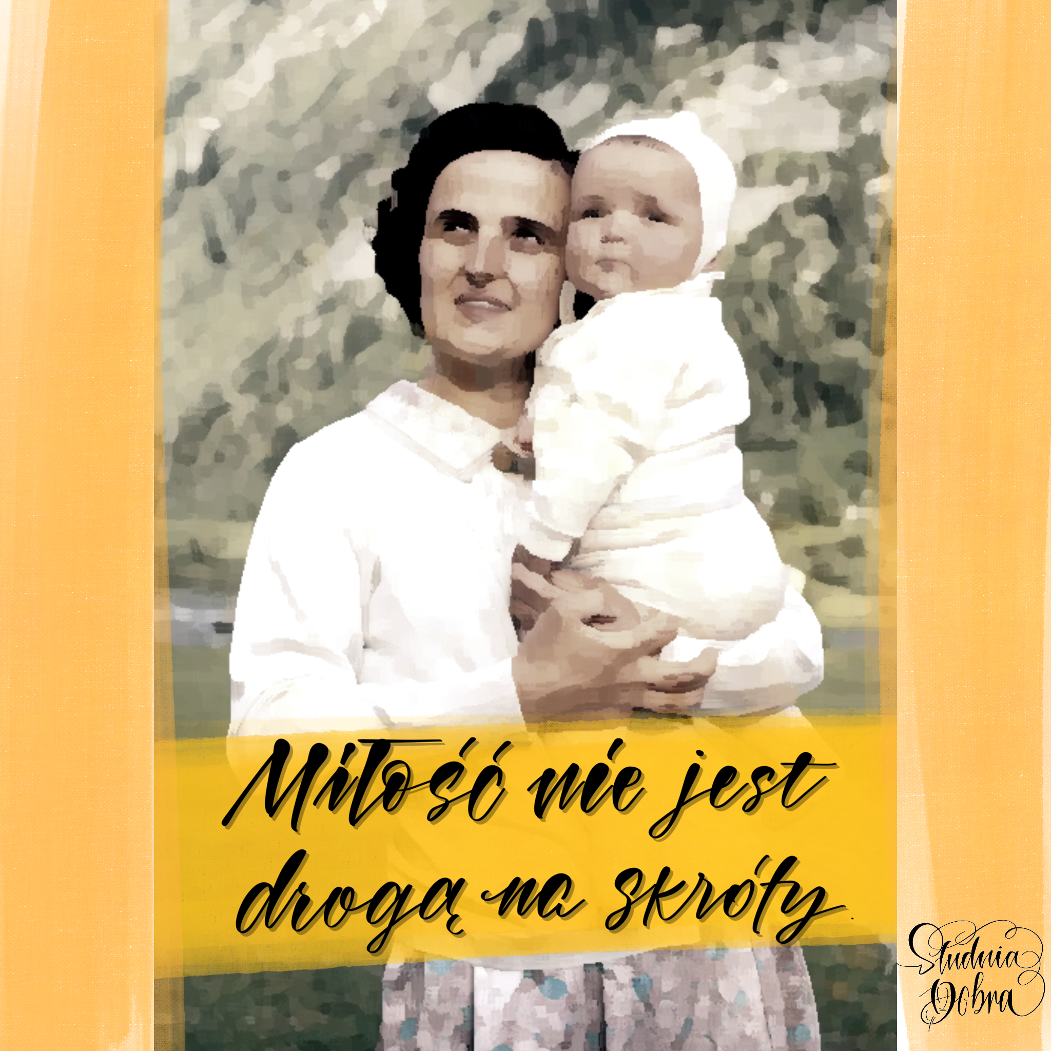 Święta Joanna Beretta Molla - wizerunek wraz z cytatem: "Miłość nie jest drogą na skróty ", napisany w ozdobnej, nowoczesnej formie.