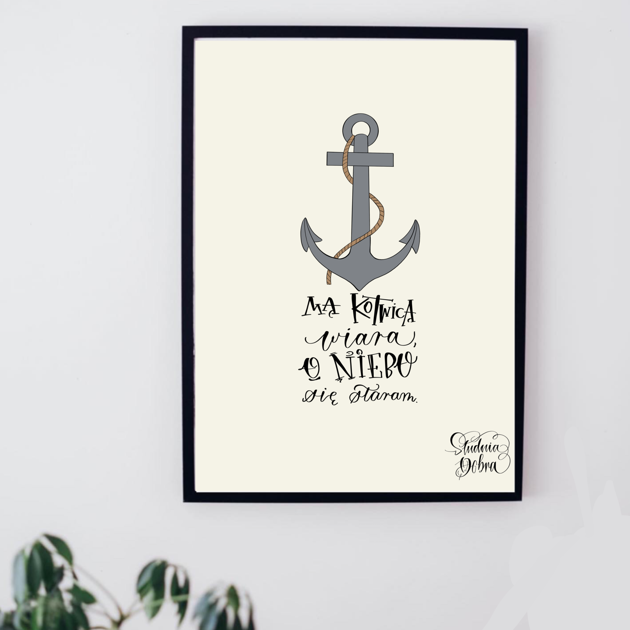 Idealny jako prezent na rózne okazje. Przedstawia cytat: Mą kotwicą wiara. O niebo się staram.". Cytat napisany jest w ozdobnej, nowoczesnej formie.