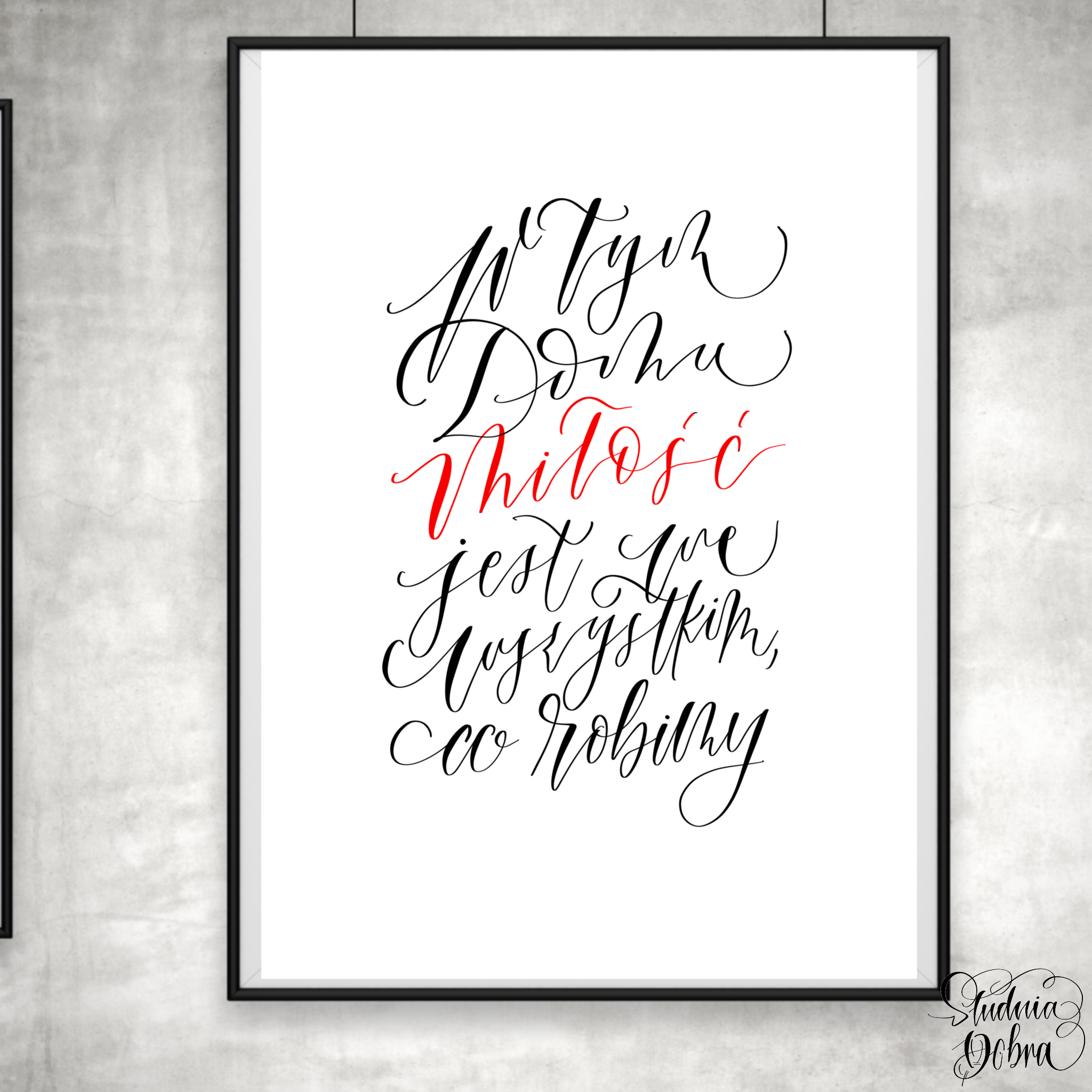 Idealny jako prezent na ślubne okazje. Zawiera autorski cytat: "W tym domu miłość jest we wszystkim, co robimy". Cytat napisany ozdobnym krojem pisma.