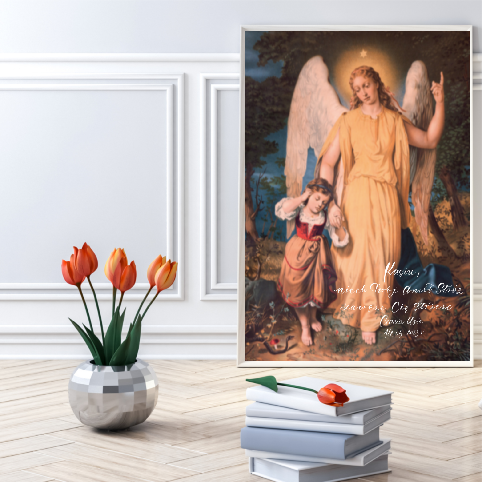 Idealny jako prezent na różne okazje. Przedstawia Anioła Stróża spacerującego z Dzieckiem.
