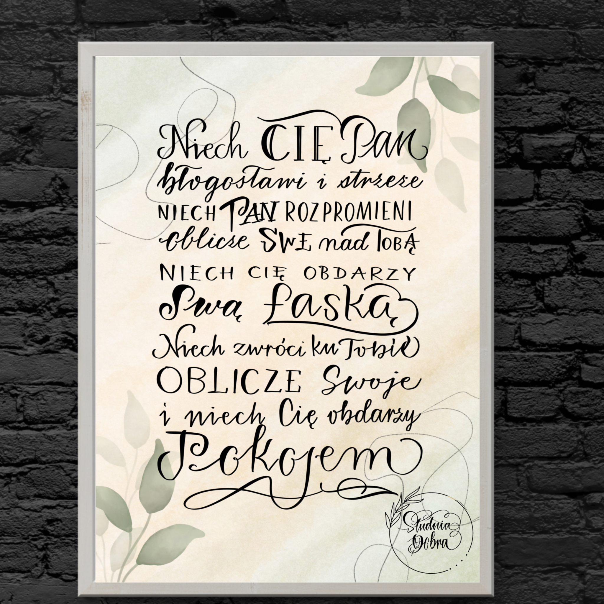 Idealny jako prezent na różne okazje. Przedstawia cytat biblijny: "Niech cię Pan błogosławi i strzeże. Nie Pan rozpromieni oblicze Swe nad tobą. Niech cię obdarzy swą łaską. Niech zwróci ku tobie oblicze Swoje i niech cię obdarzy pokojem".