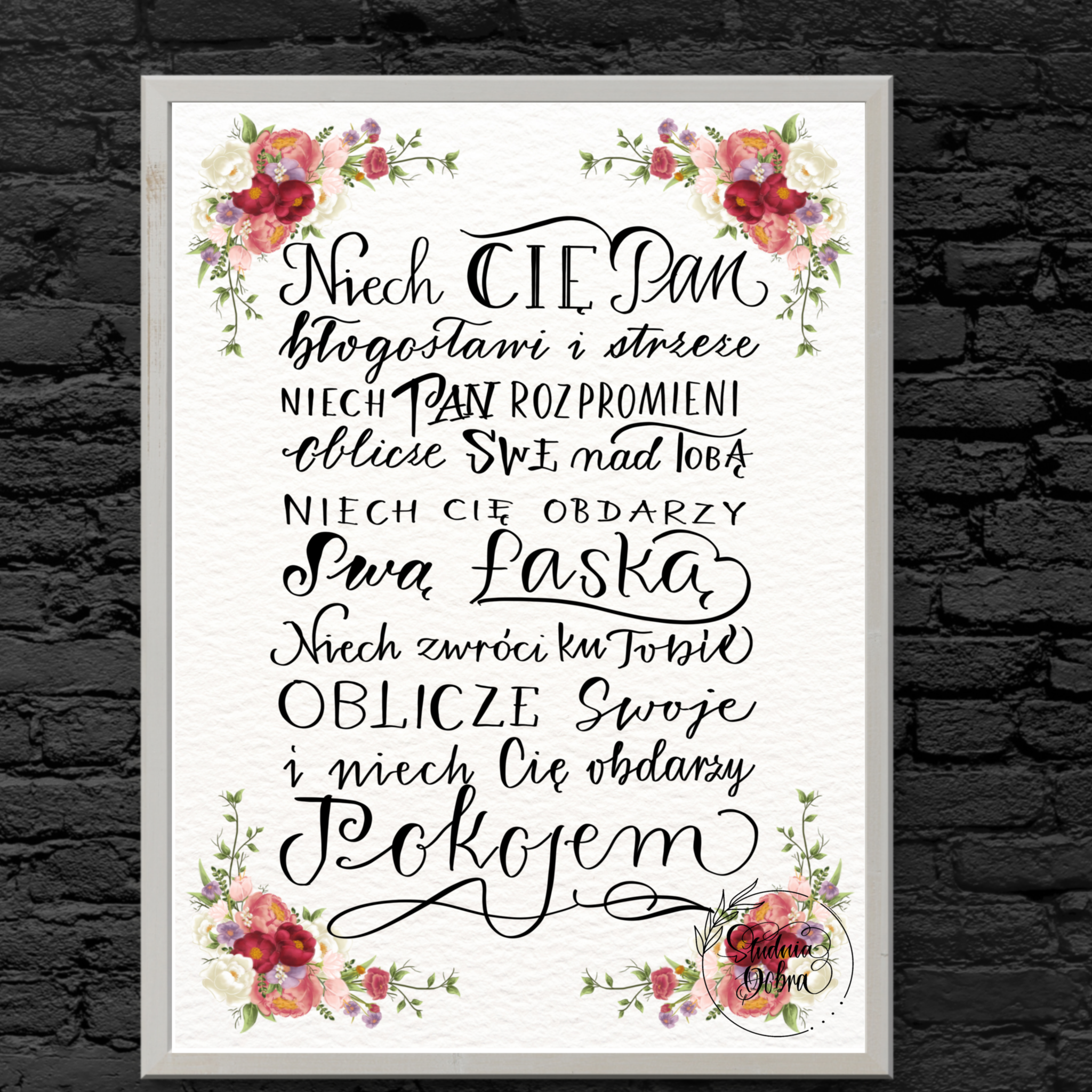 Przedstawia cytat biblijny: "Niech cię Pan błogosławi i strzeże. Nie Pan rozpromieni oblicze Swe nad tobą. Niech cię obdarzy swą łaską. Niech zwróci ku tobie oblicze Swoje i niech cię obdarzy pokojem".