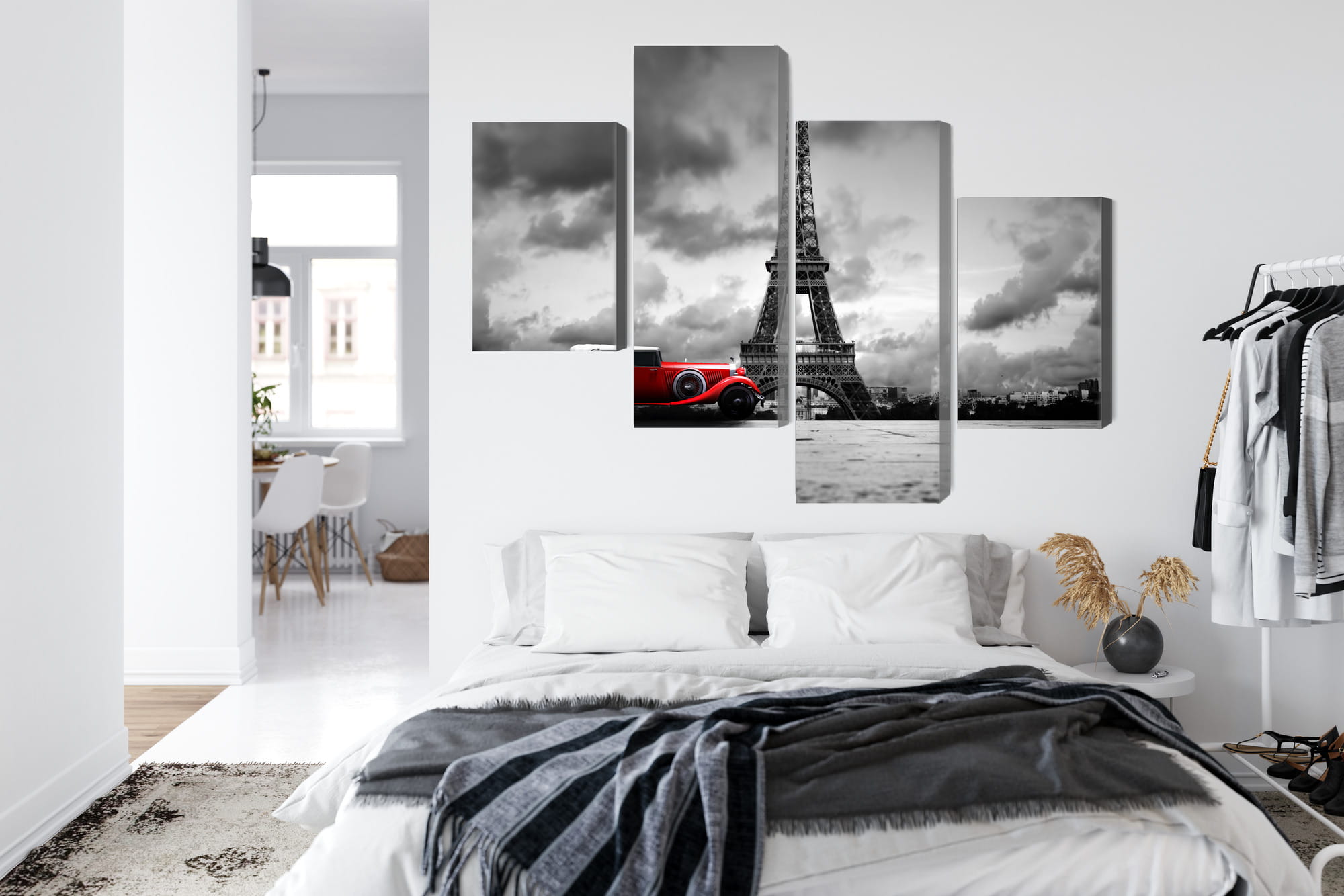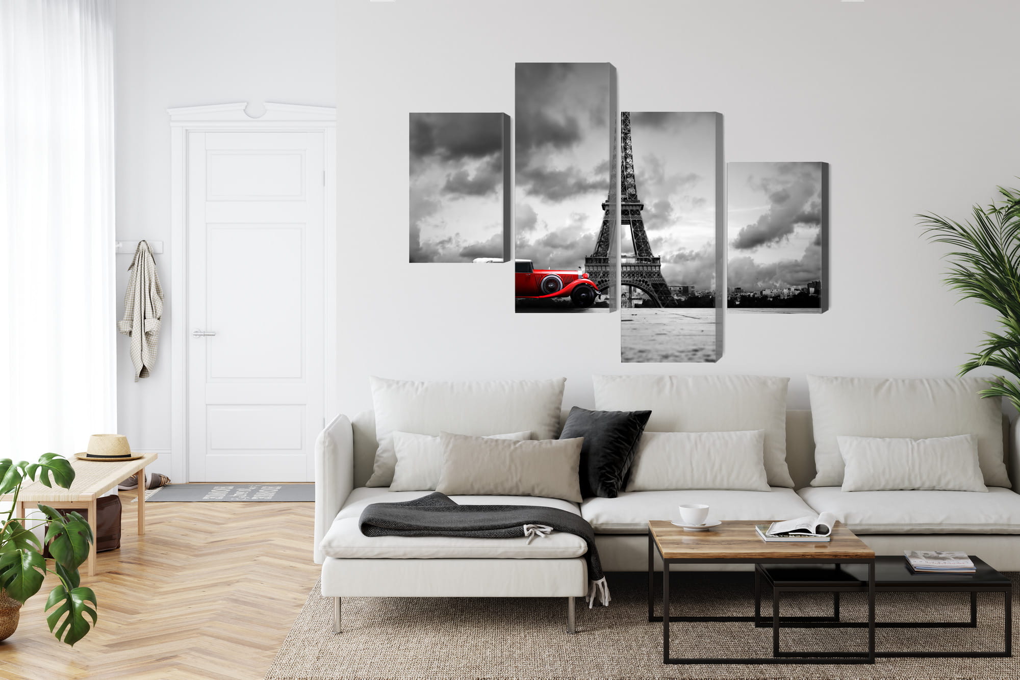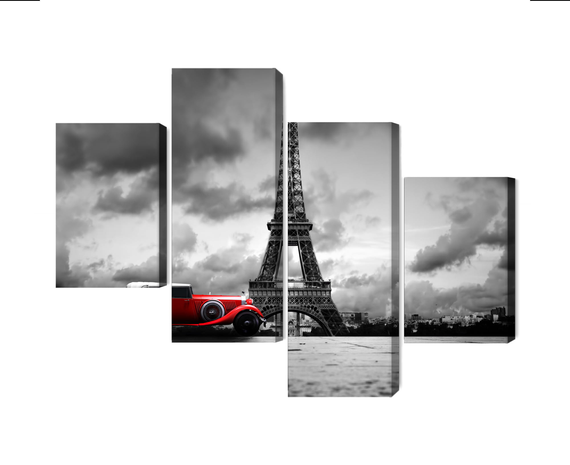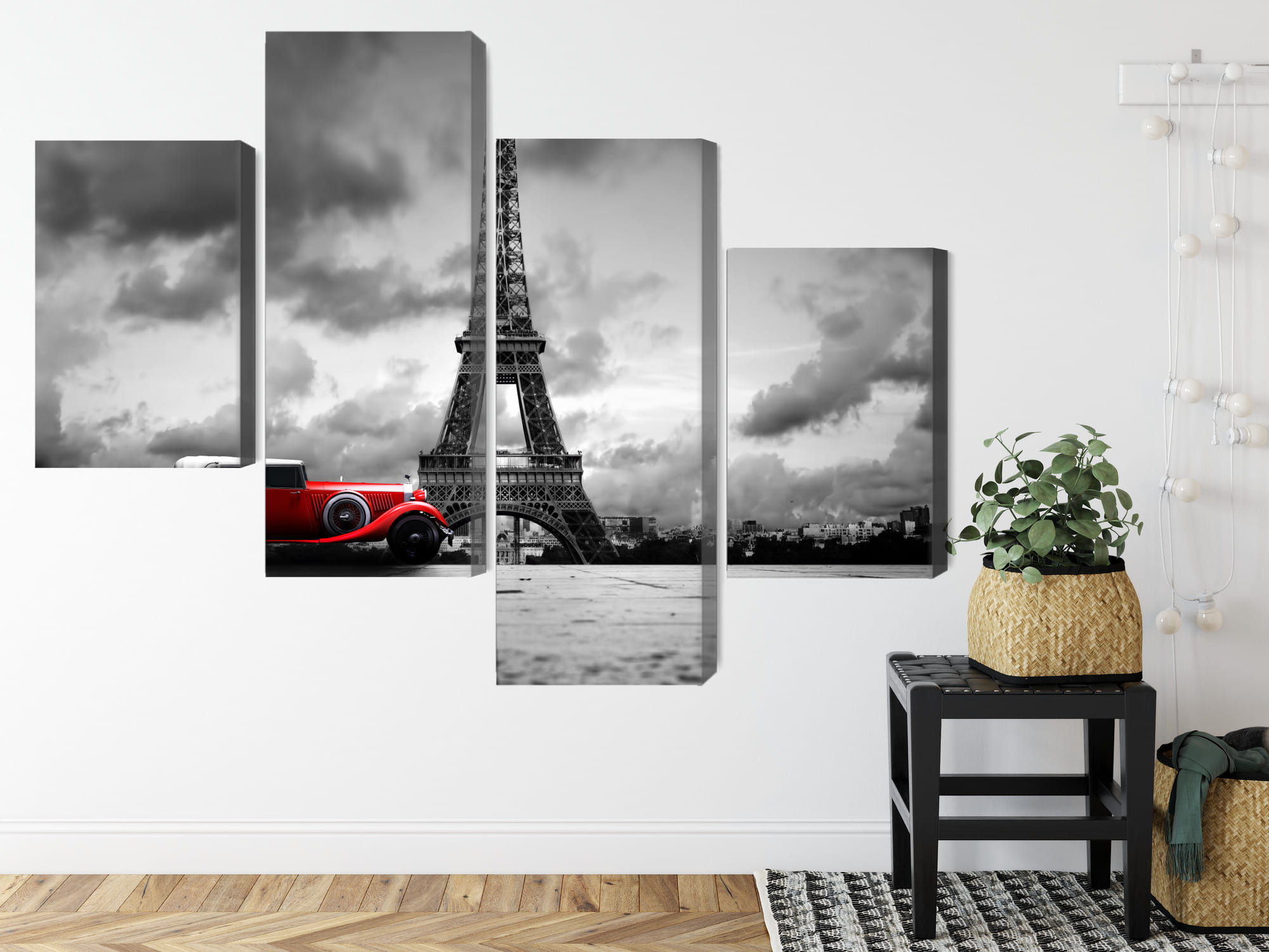 Obraz Wieloczęściowy Czarno-Biały Widok Na Wieżę Eiffla I Samochód Retro