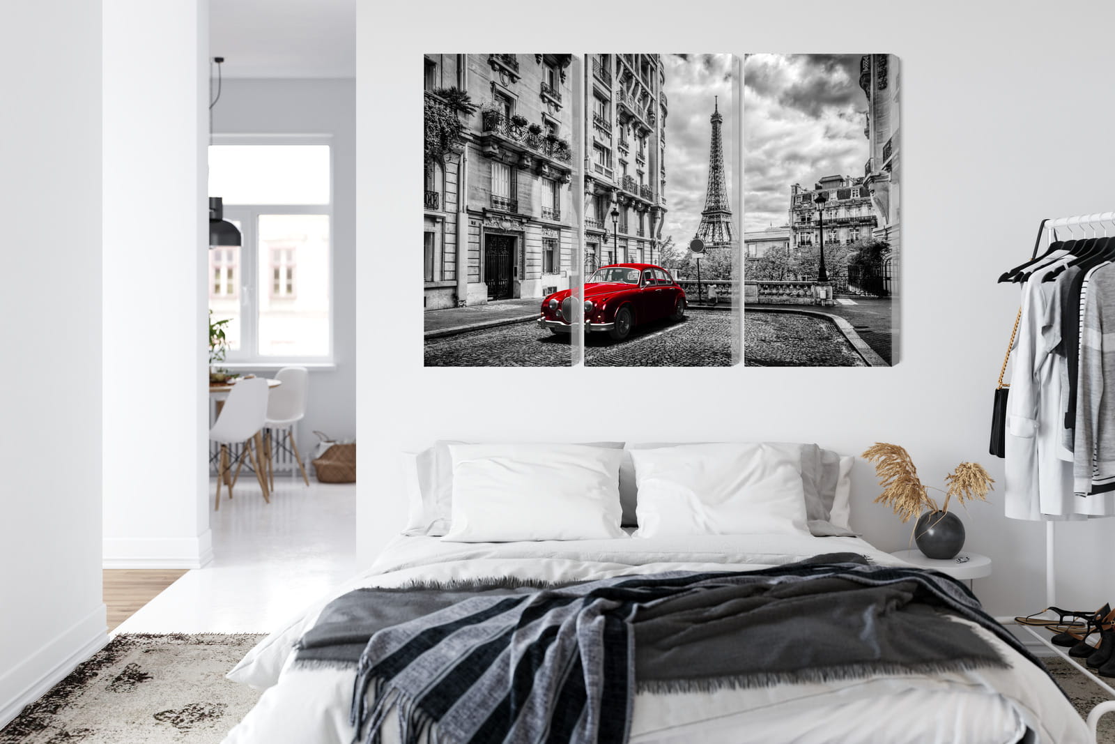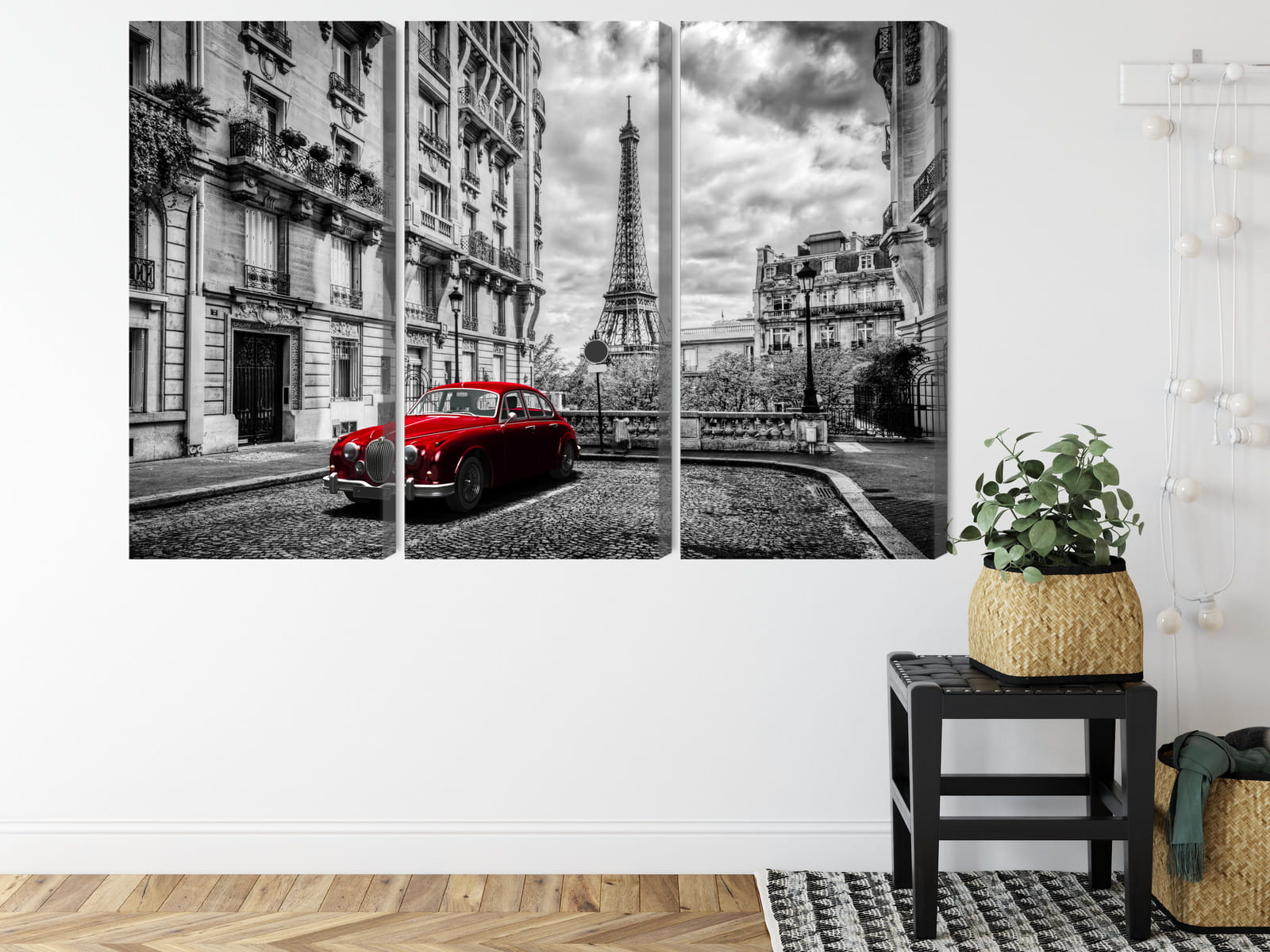 Obraz Wieloczęściowy Czerwony Samochód Retro Na Tle Wieży Eiffla