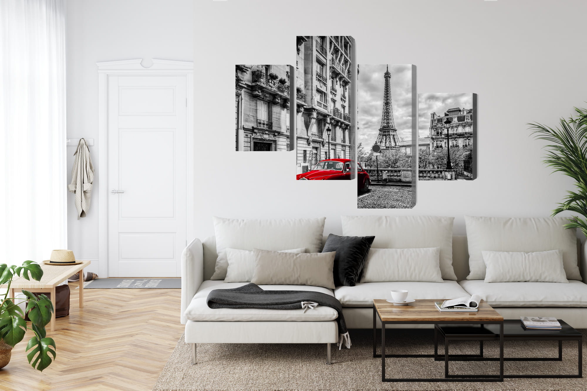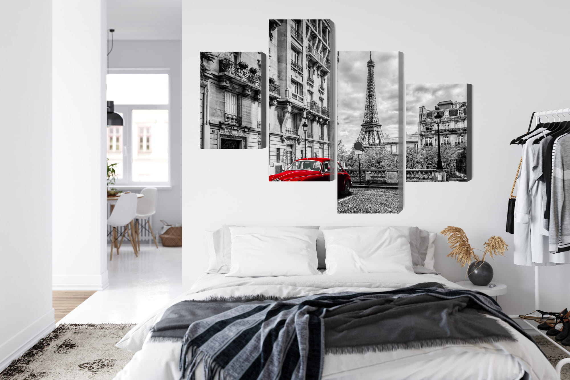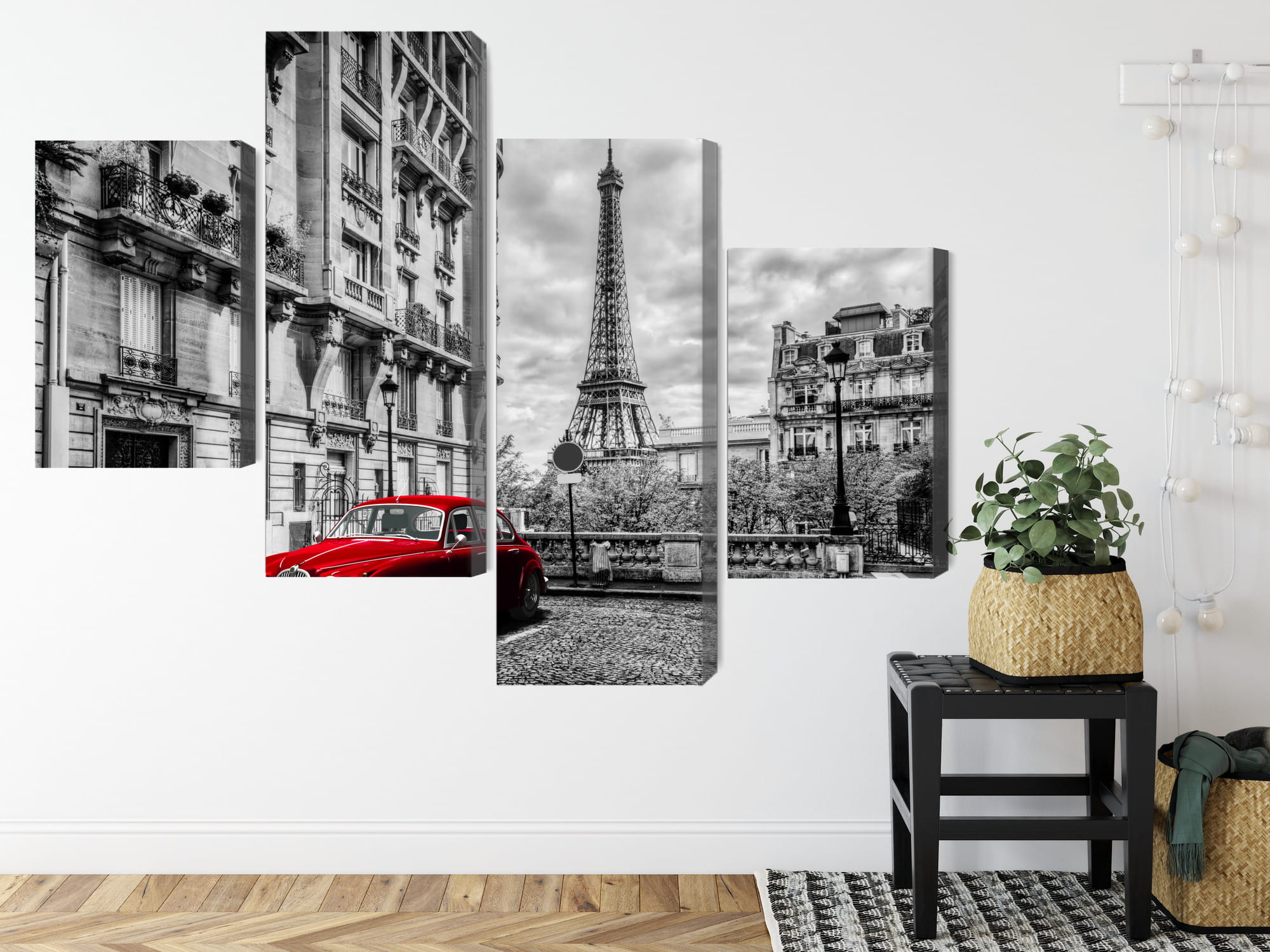 Obraz Wieloczęściowy Czerwony Samochód W Stylu Retro Na Tle Wieży Eiffla