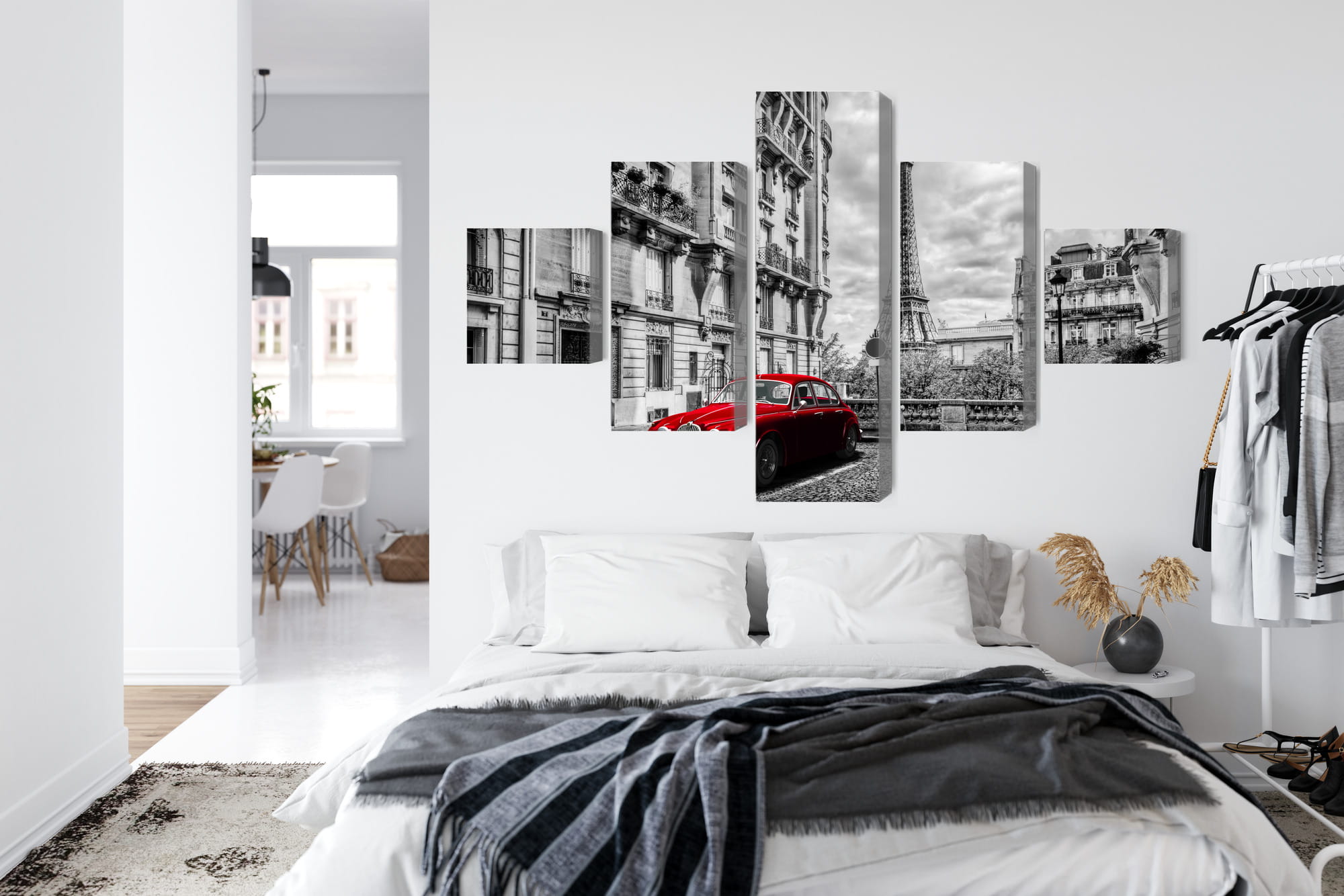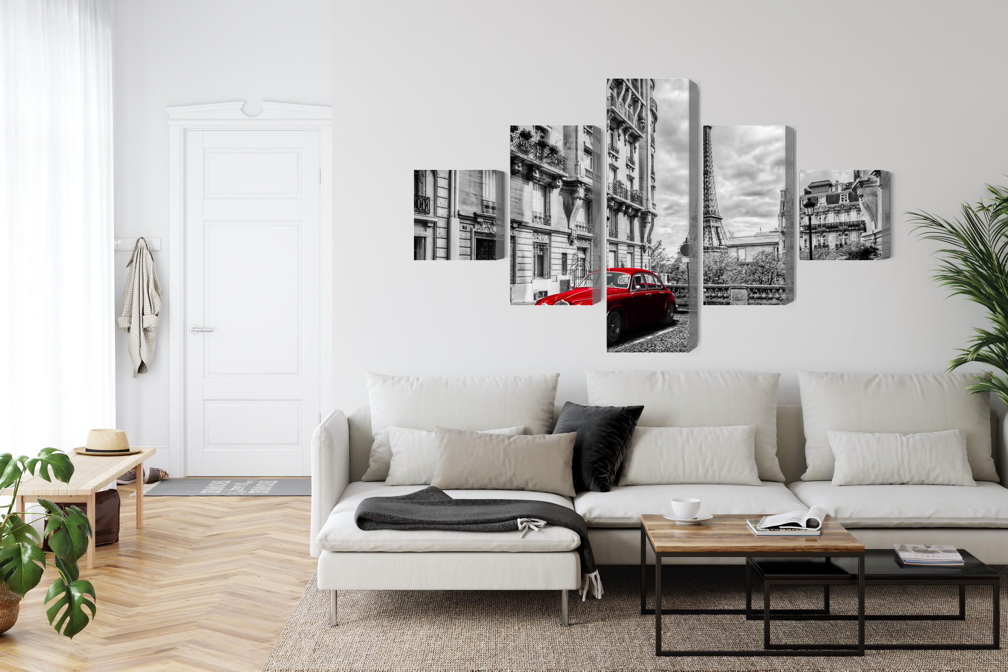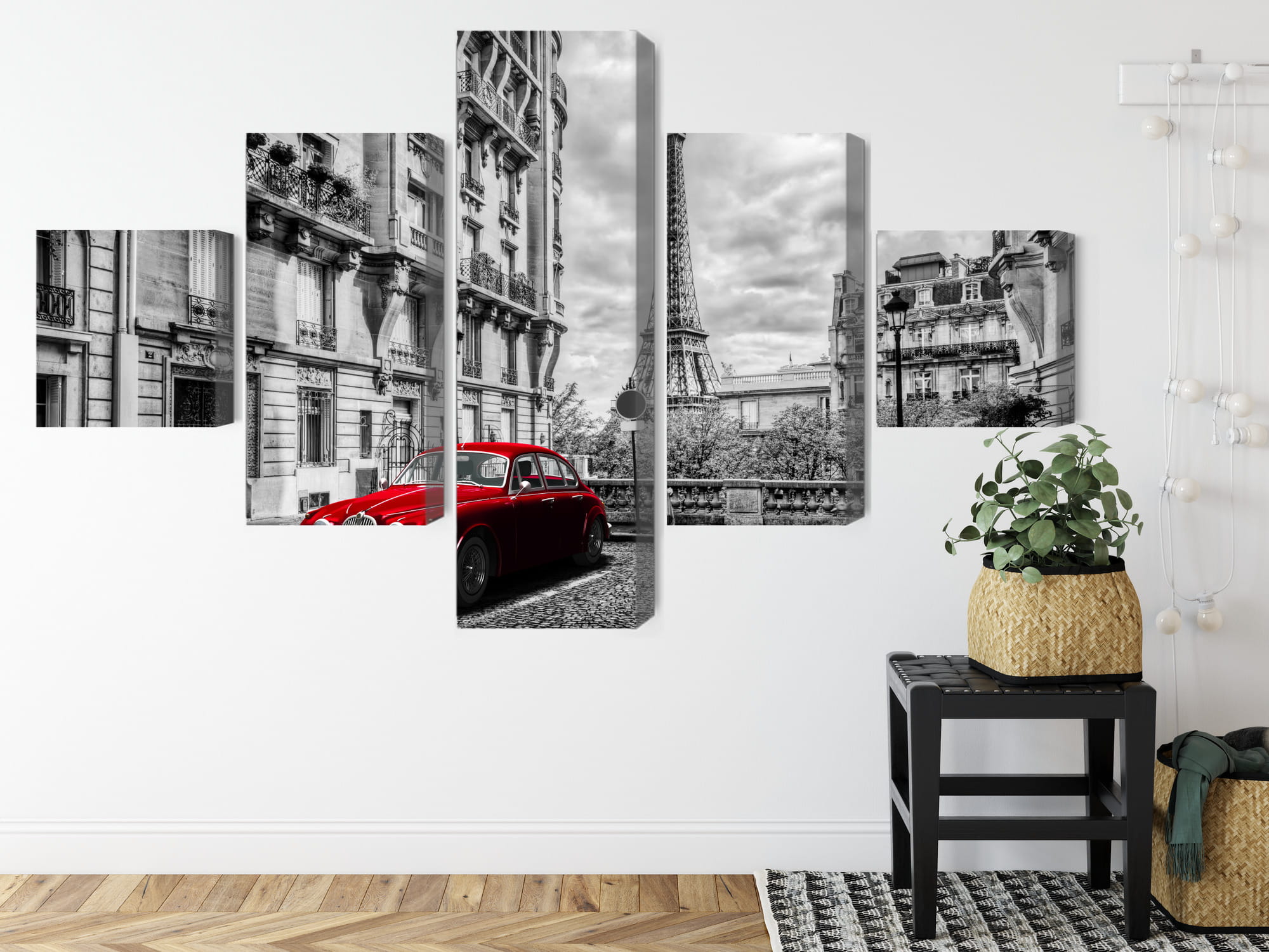 Obraz Wieloczęściowy Czerwony Samochód W Stylu Retro Na Tle Wieży Eiffla