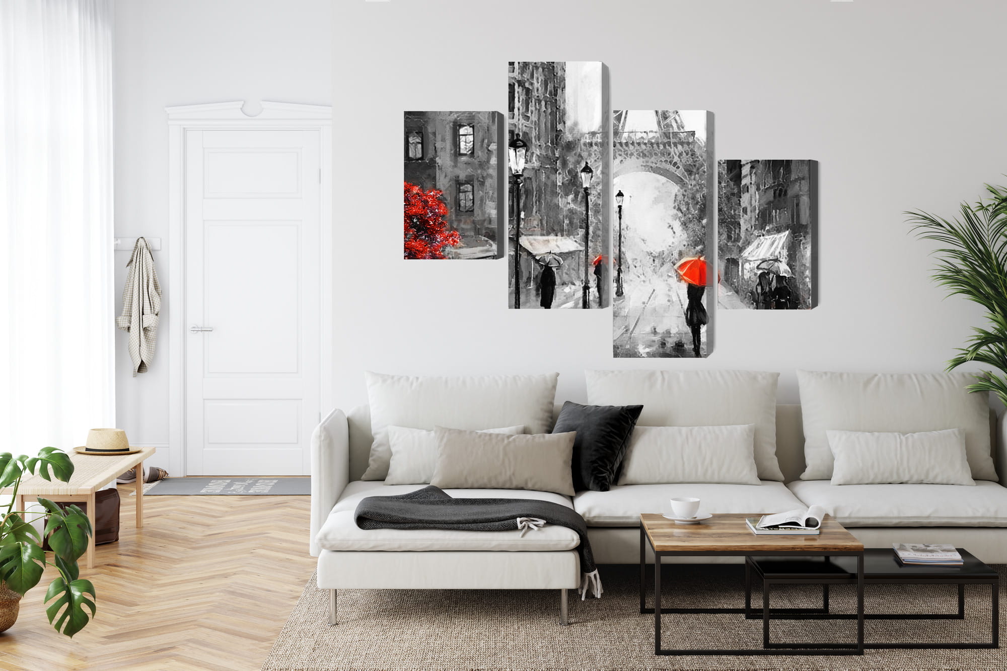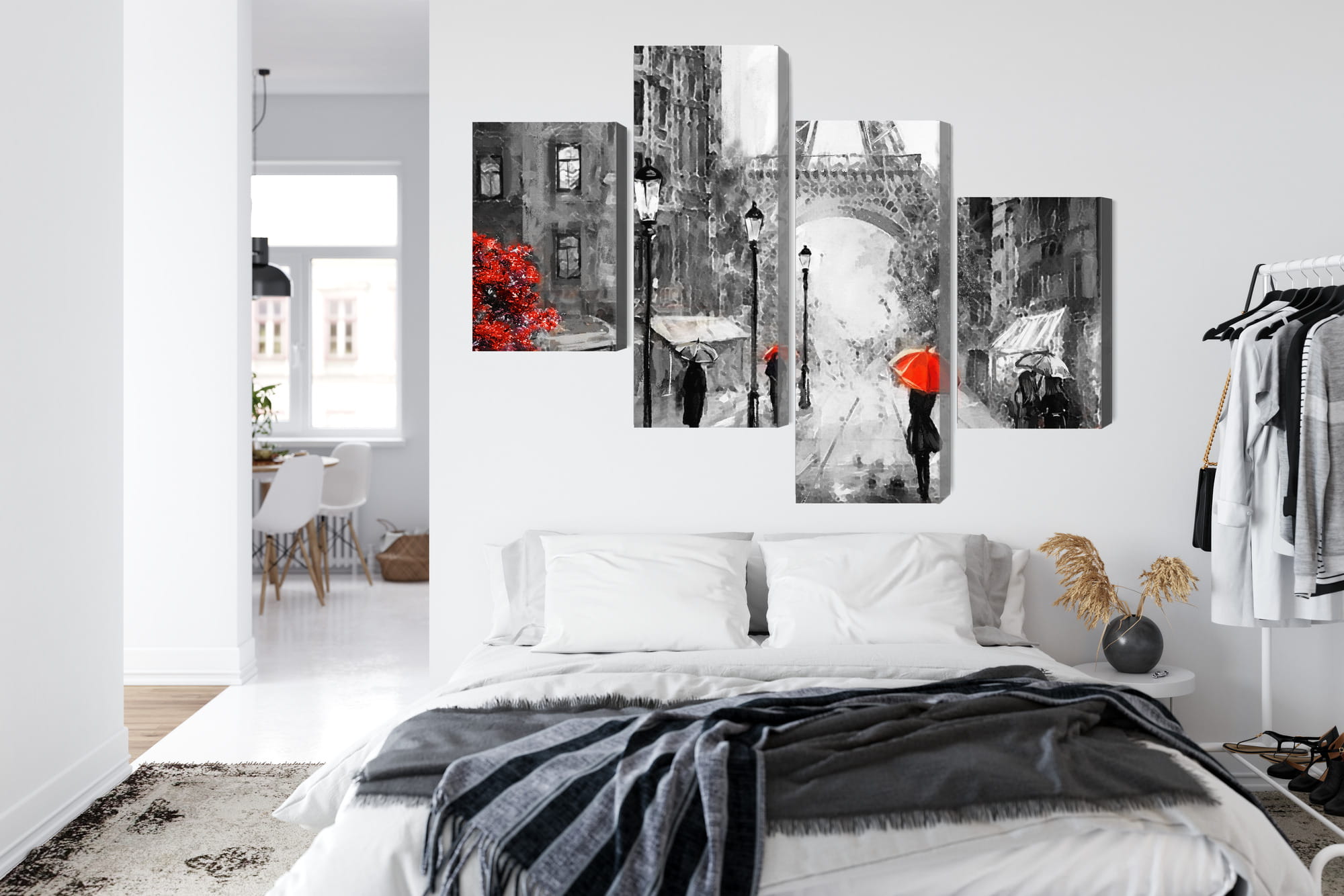 Obraz Wieloczęściowy Ludzie Z Czerwonymi Parasolami Na Ulicy Paryża