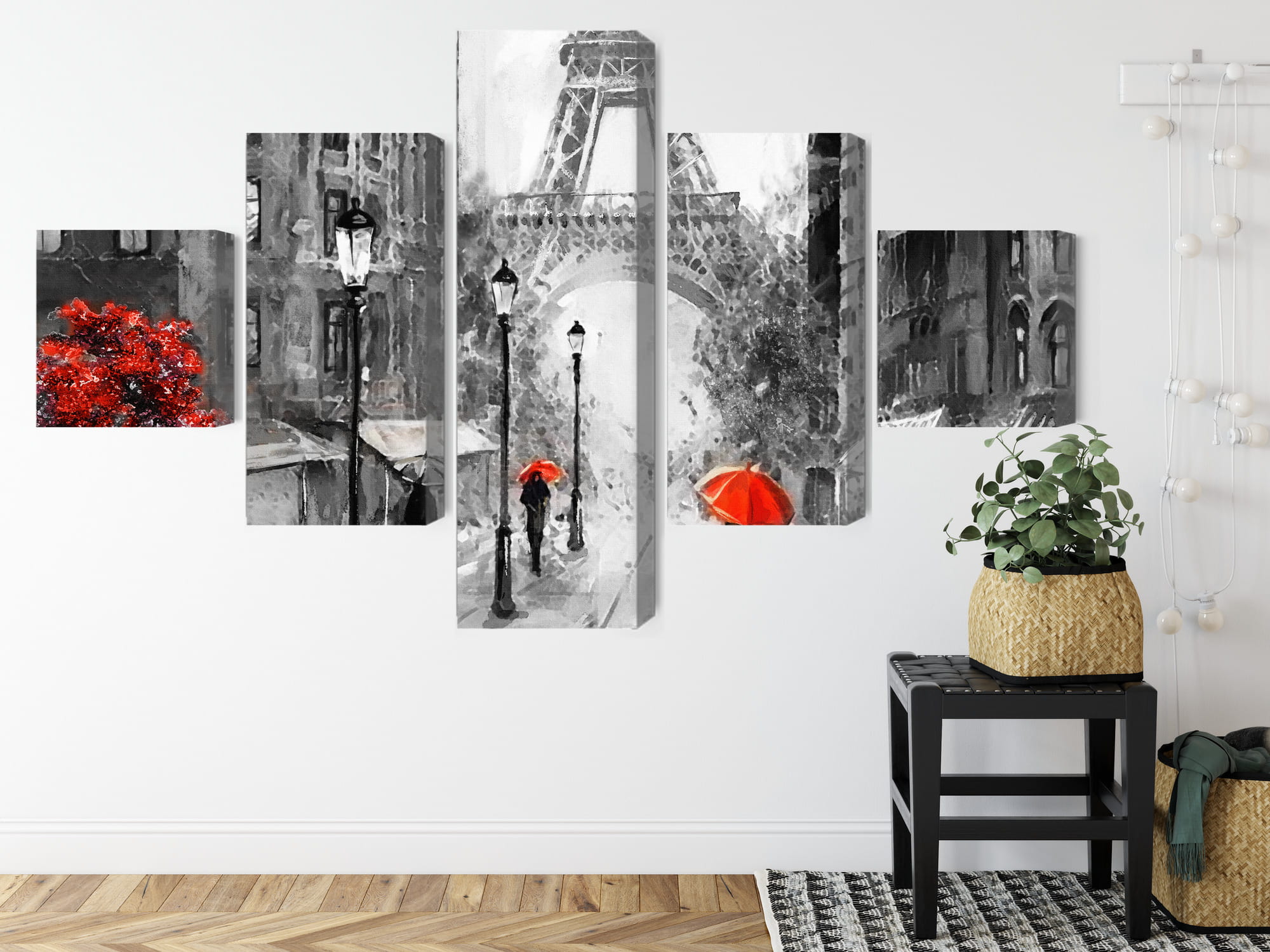 Obraz Wieloczęściowy Ludzie Z Czerwonymi Parasolami Na Ulicy Paryża