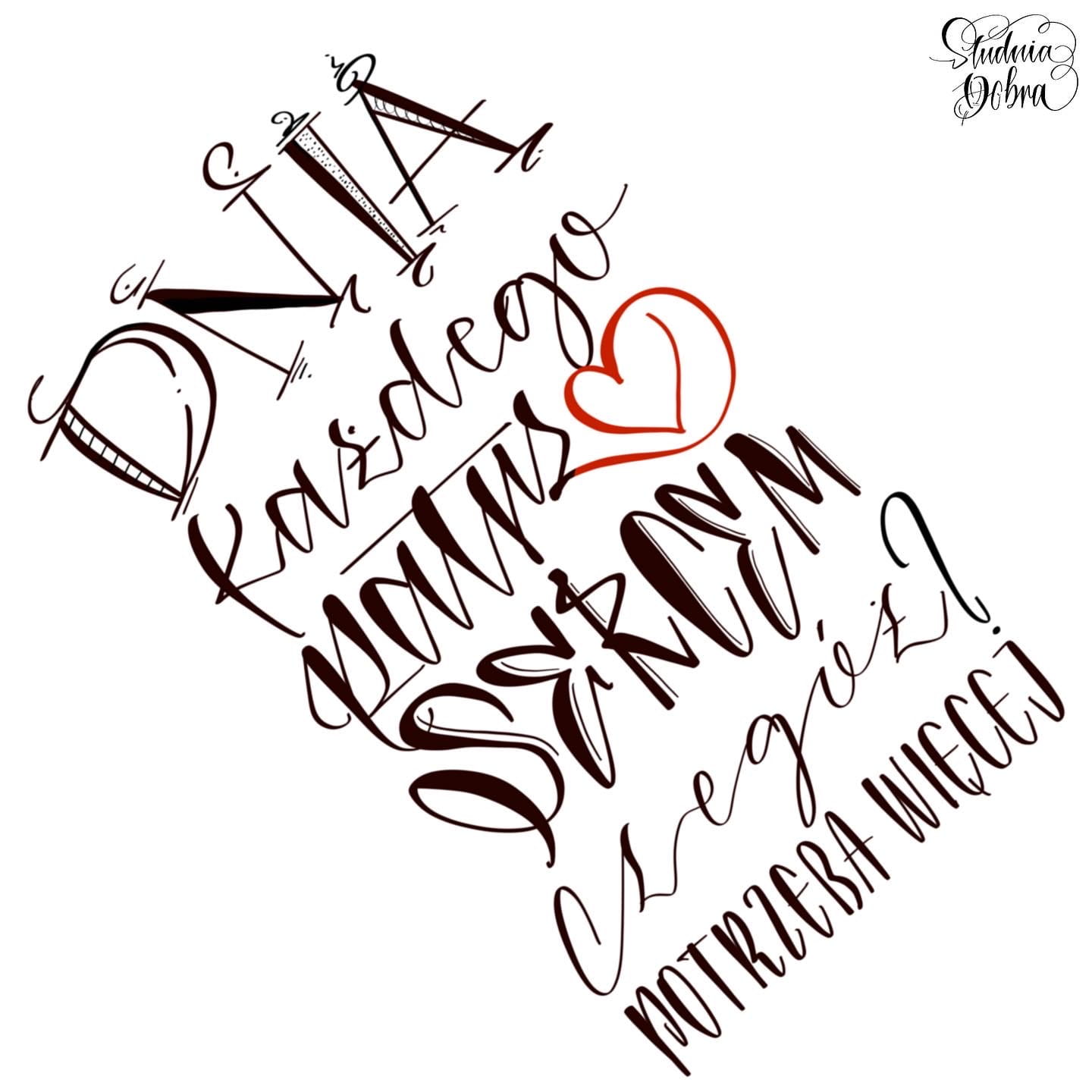 Zawiera CYTAT: "Dnia każdego patrz sercem, czegóż potrzeba więcej?". Napis w nowoczesnej formie.