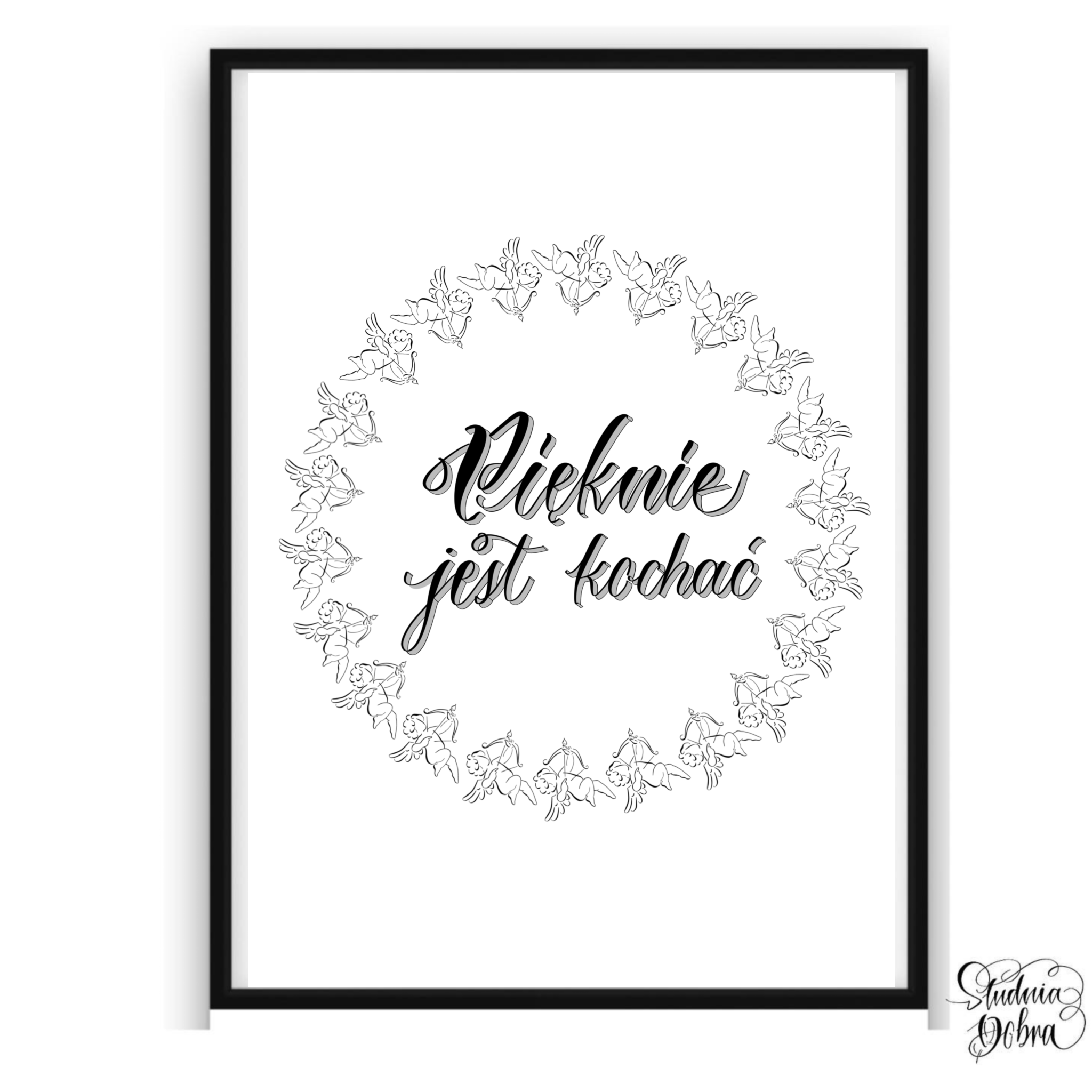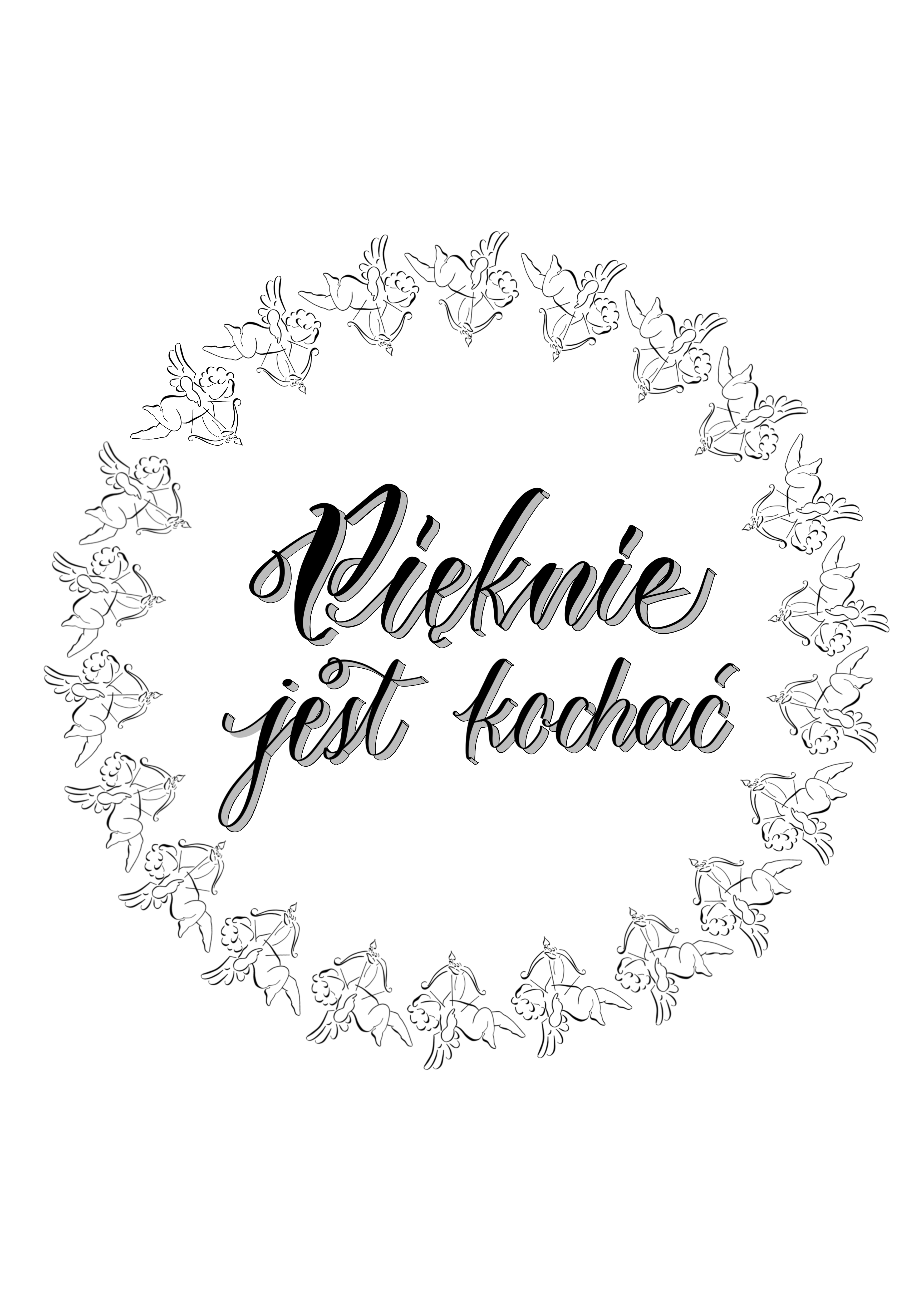 Idealny jako prezent na różne okazje. Zawiera autorski cytat: "Pięknie jest kochać", wzbogacony wizerunkami aniołów wokół. Cytat napisany ozdobnym krojem pisma.