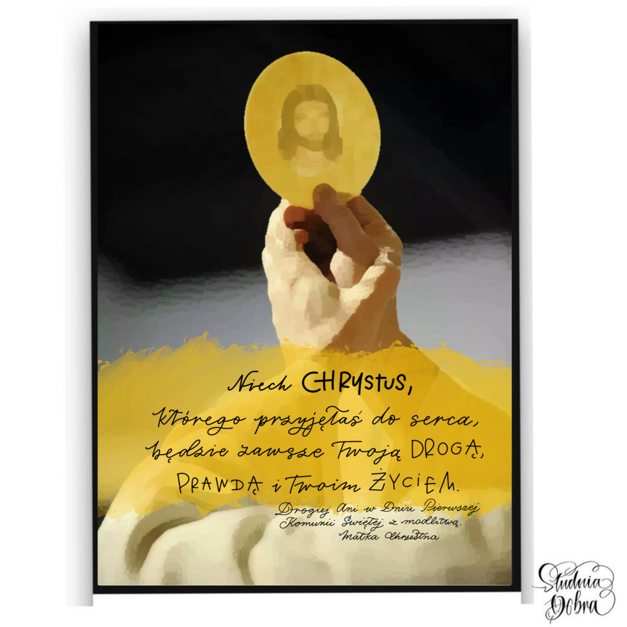 Piękny plakat na upominek - podziękowanie z okazji Pierwszej Komunii Świętej Dziecka. Zawiera napis: "Niech Chrystus, którego przyjąłeś/aś do serca, będzie zawsze Twoją drogą, prawdą, Twoim życiem" wraz z okolicznościową grafiką w postaci rąk i hostii. Jasny odcień.