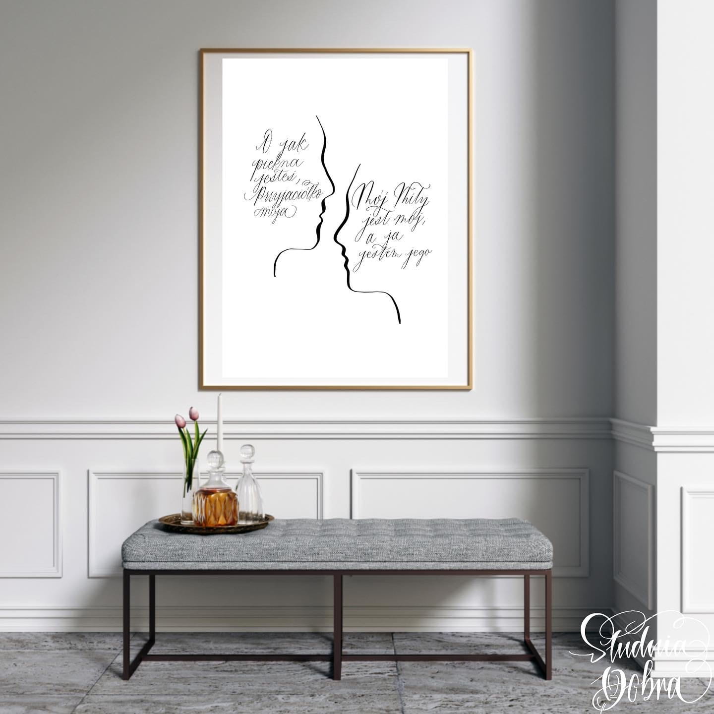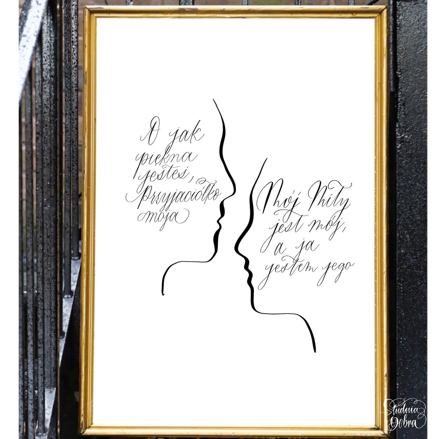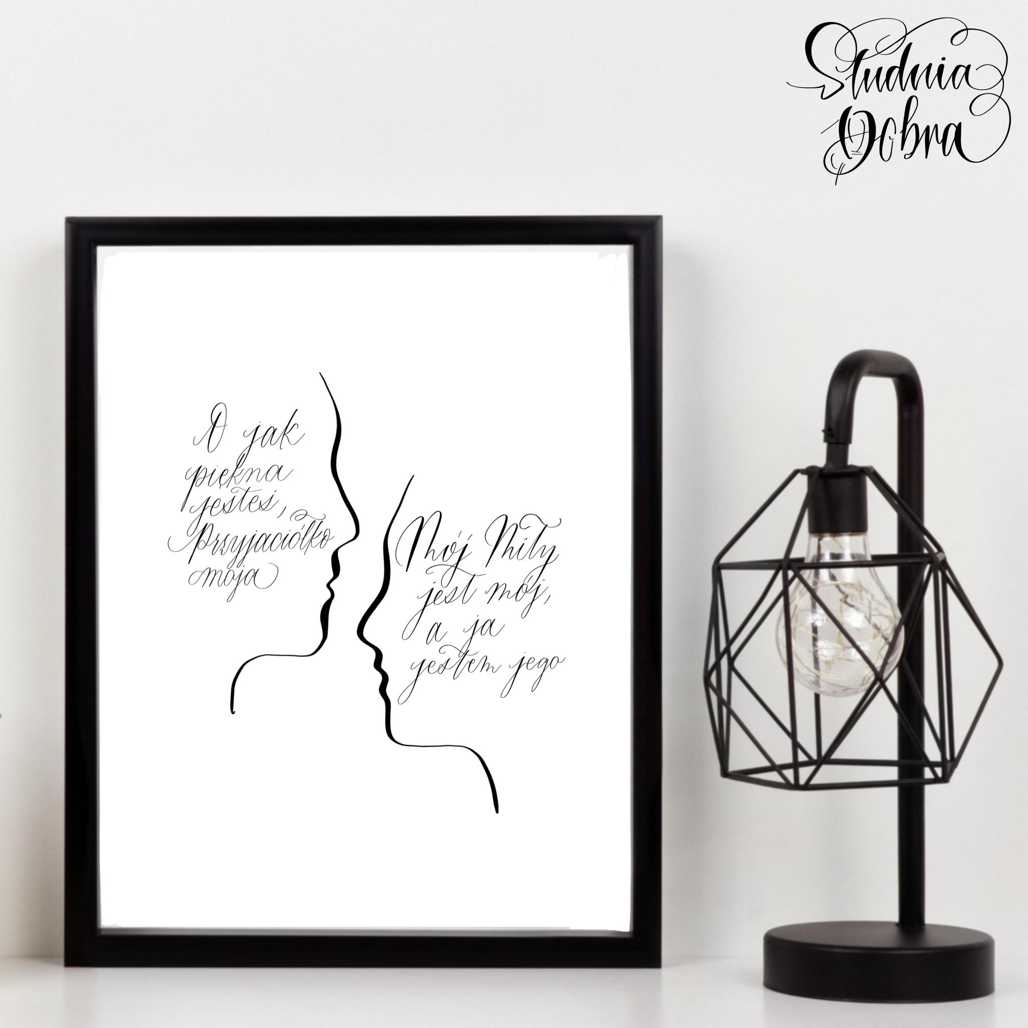Idealny jako prezent na ślubne okazje. Zawiera dwa cytaty z Pieśni nad Pieśniami: "O jak piękna jesteś, Przyjaciółko moja" oraz "Mój miły jest mój, a ja jestem jego". Cytaty umieszczone są w dwóch grafikach, przedstawiających kontur kobiety i mężczyzny.
