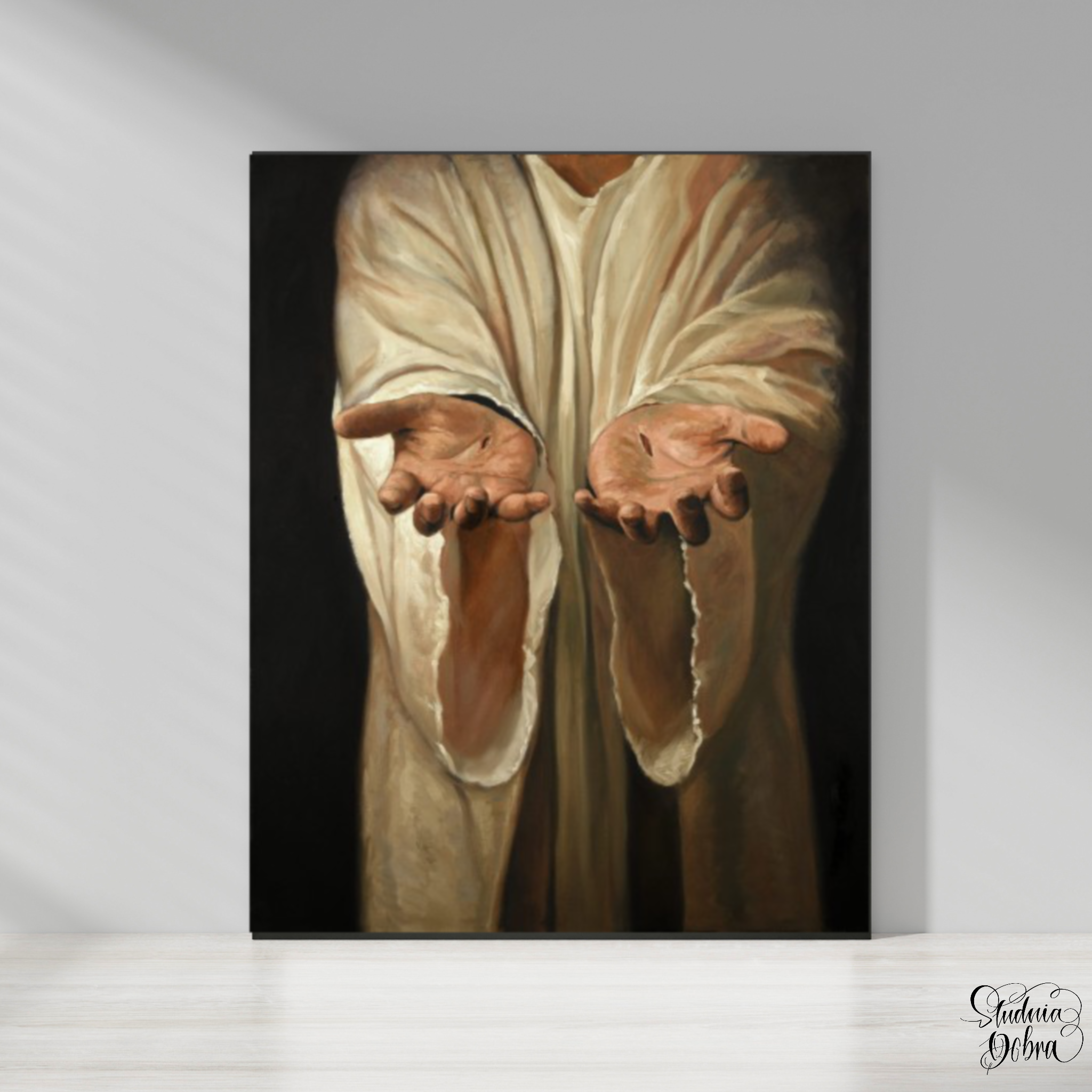 Idealny jako prezent na różne okazje. Przedstawia piękny obraz przebitych rąk Jezusa po Zmartwychwstaniu.