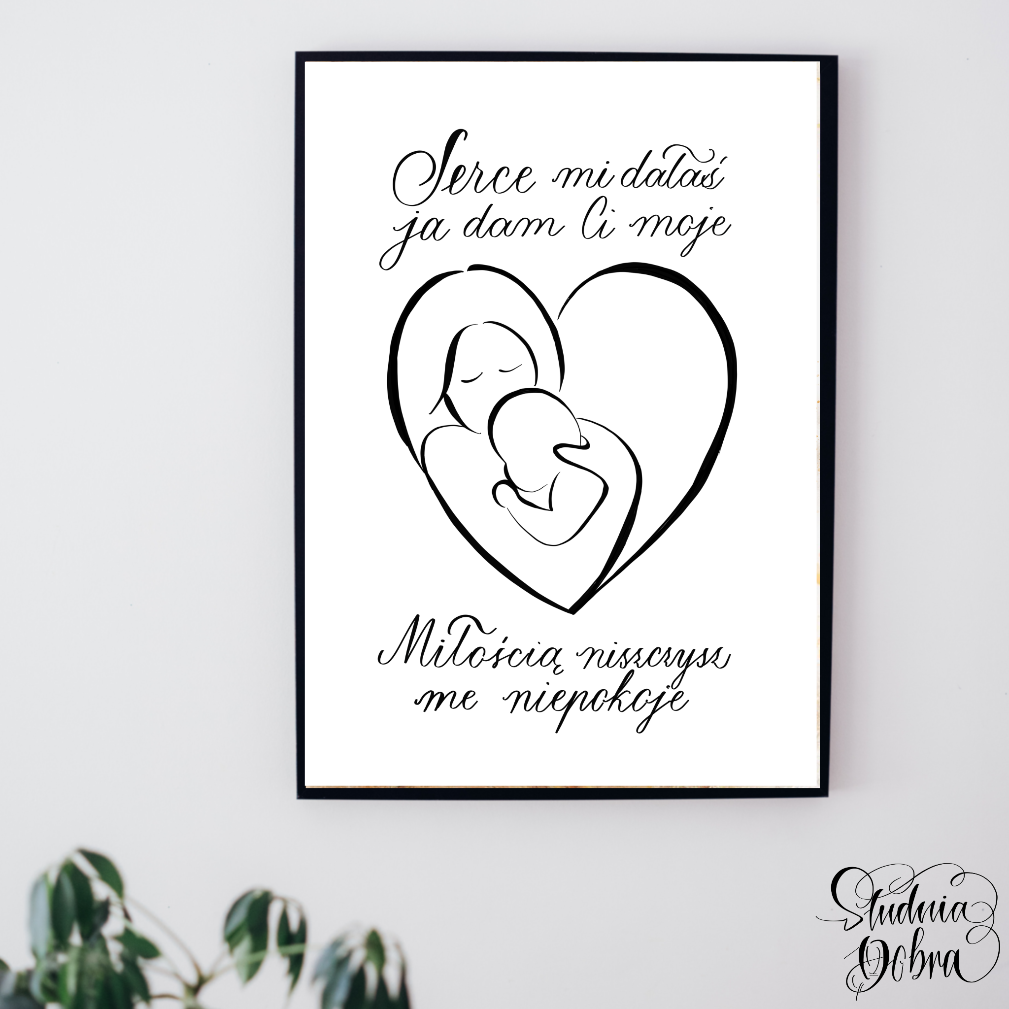 Idealny jako prezent na Dzień Matki. Przedstawia słowa "Serce mi dałaś, ja dam Ci moje. Miłością niszczysz me niepokoje", napisane w ozdobnej, nowoczesnej formie. Z okazyjną grafiką.
