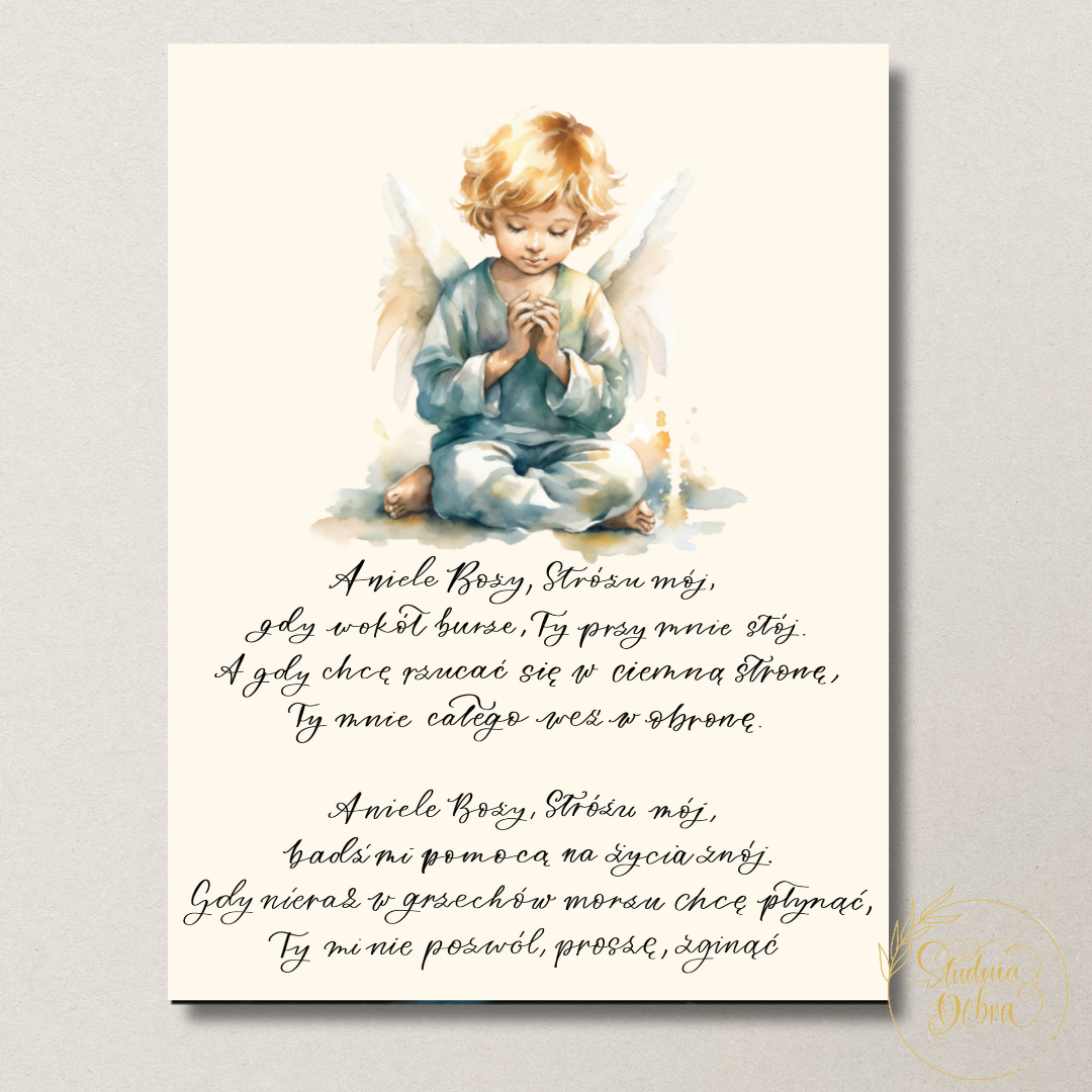 Idealny jako prezent na różne okazje. Przedstawia wizerunek Anioła Stróża wraz z okolicznościowym wierszem - modlitwą.