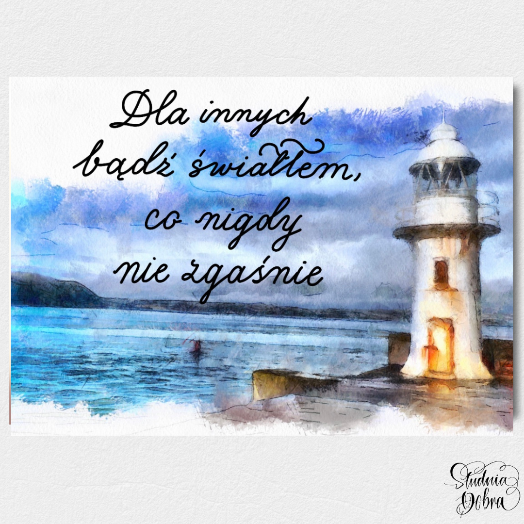 Idealny jako prezent na różne okazje. Przedstawia ciekawy obraz latarni morskiej z cytatem: "Dla innych bądź światłem, co nigdy nie zgaśnie"..
