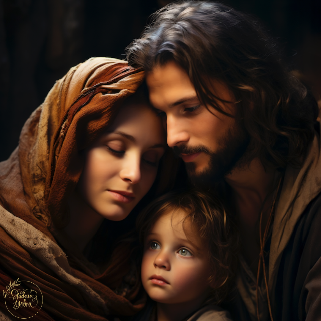Święta Rodzina. Maryja, Józef i mały Jezus. W nieco nietypowym ujęciu, ale bardzo pięknym i tajemniczym.