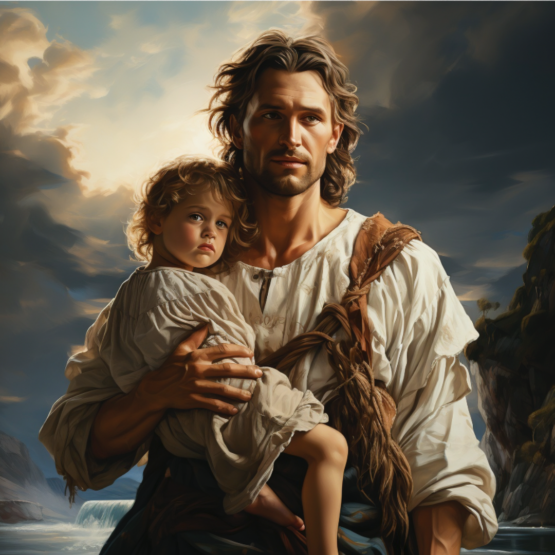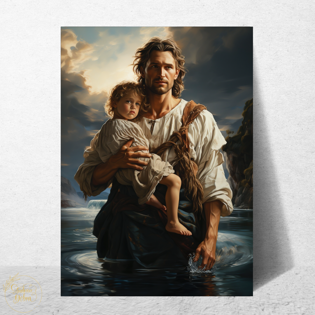 Obraz przedstawiący świętego Krzysztofa, trzymającego w ramionach małego Jezusa.
