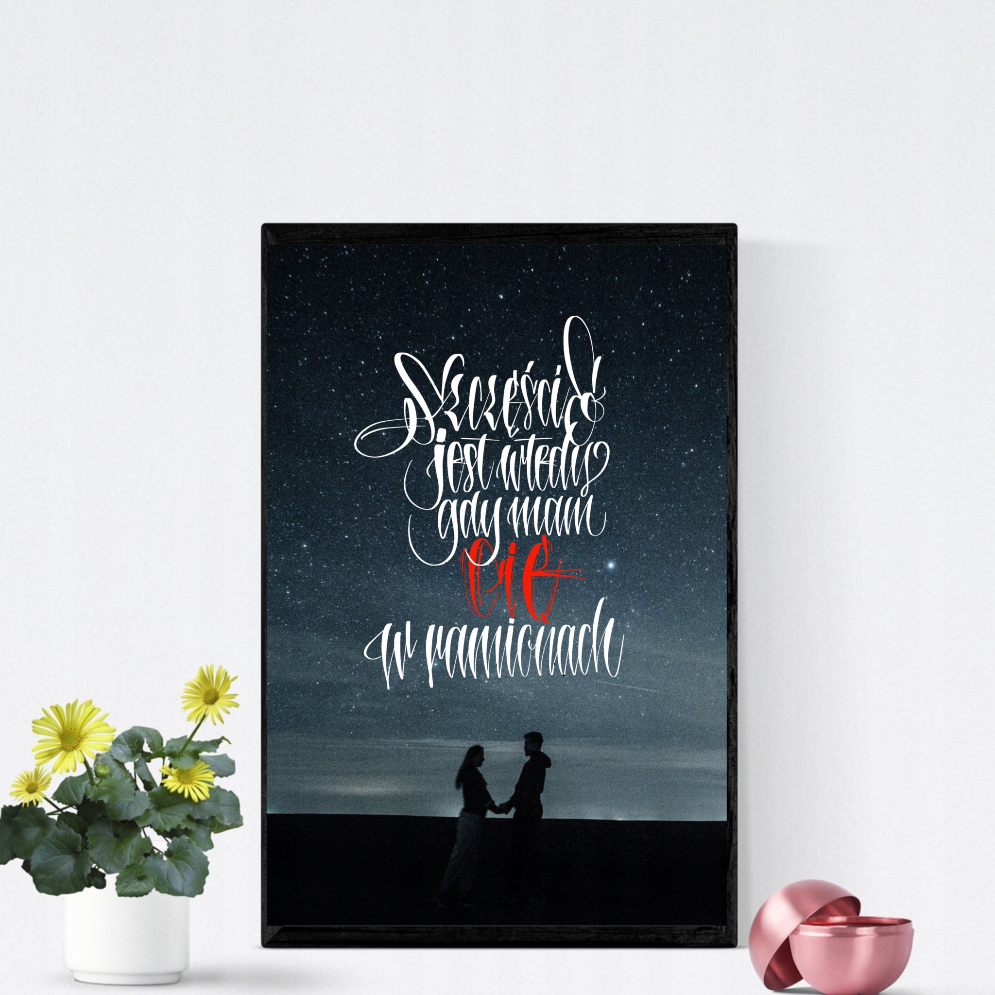 Idealny jako prezent na każda okazję. Zawiera cytat: "Szczęście jest wtedy, gdy trzymam Cię w ramionach". ŚWIETNY pomysł, jako ozdoba salonu, sypialni, a może kuchni?