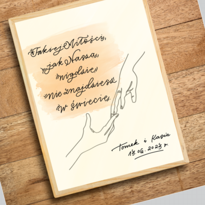 Przedstawia cytat "Takiej Miłości, jak Nasza, nigdzie nie znajdziesz w świecie", napisany w ozdobnej, nowoczesnej formie z dodatkową grafiką.
