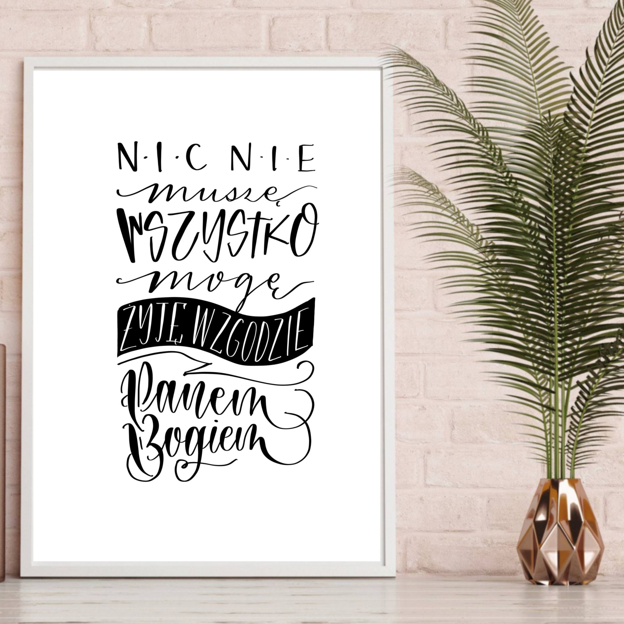 Idealny jako prezent na każda okazję. Zawiera słowa "Nic nie muszę, wszystko mogę. Żyję w zgodzie z Panem Bogiem", zapisane w ciekawy sposób, ozdobnym pismem. Dobry pomysł, jako ozdoba salonu, kuchni, sypialni.