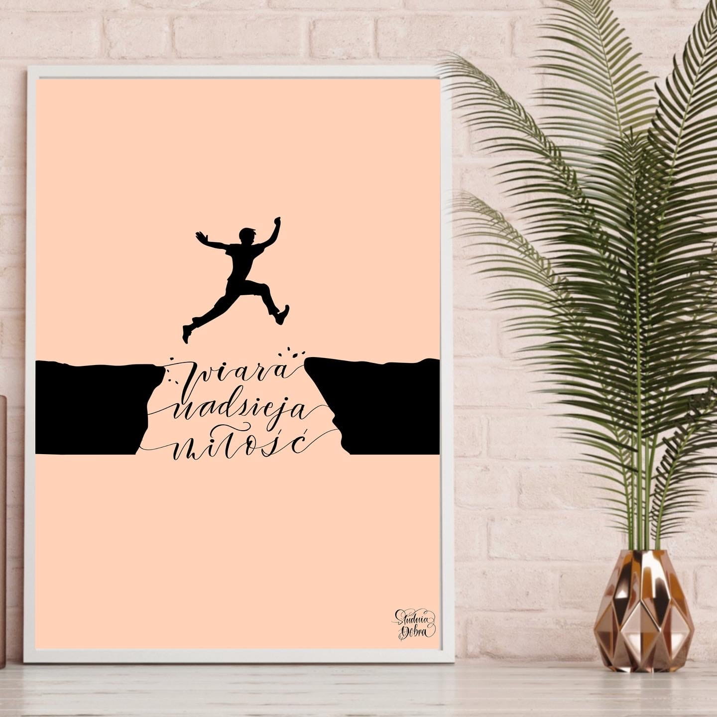 Idealny jako prezent na rózne okazje. Przedstawia słowa "Wiara, nadzieja, miłość", napisane w ozdobnej, nowoczesnej formie, wzbogacone grafiką.