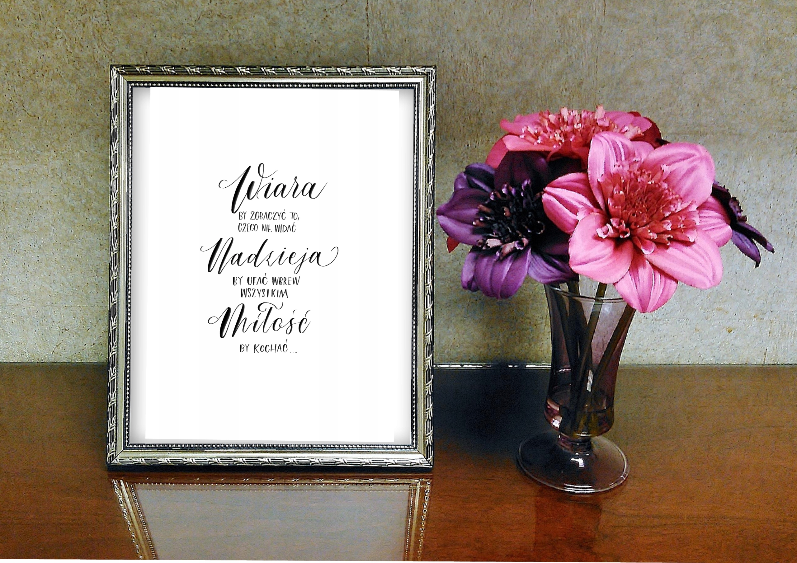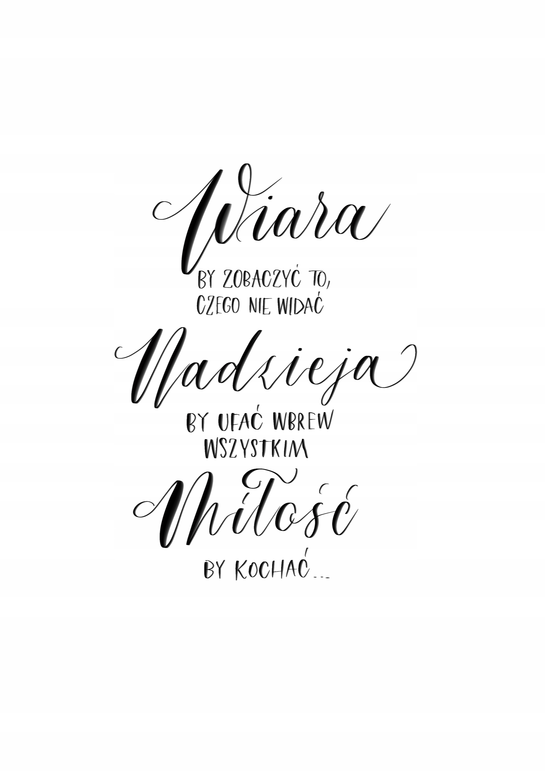 Idealny jako prezent na każda okazję. Plakat przedstawia cytat własny, opisujący wiarę, nadzieję i miłość.