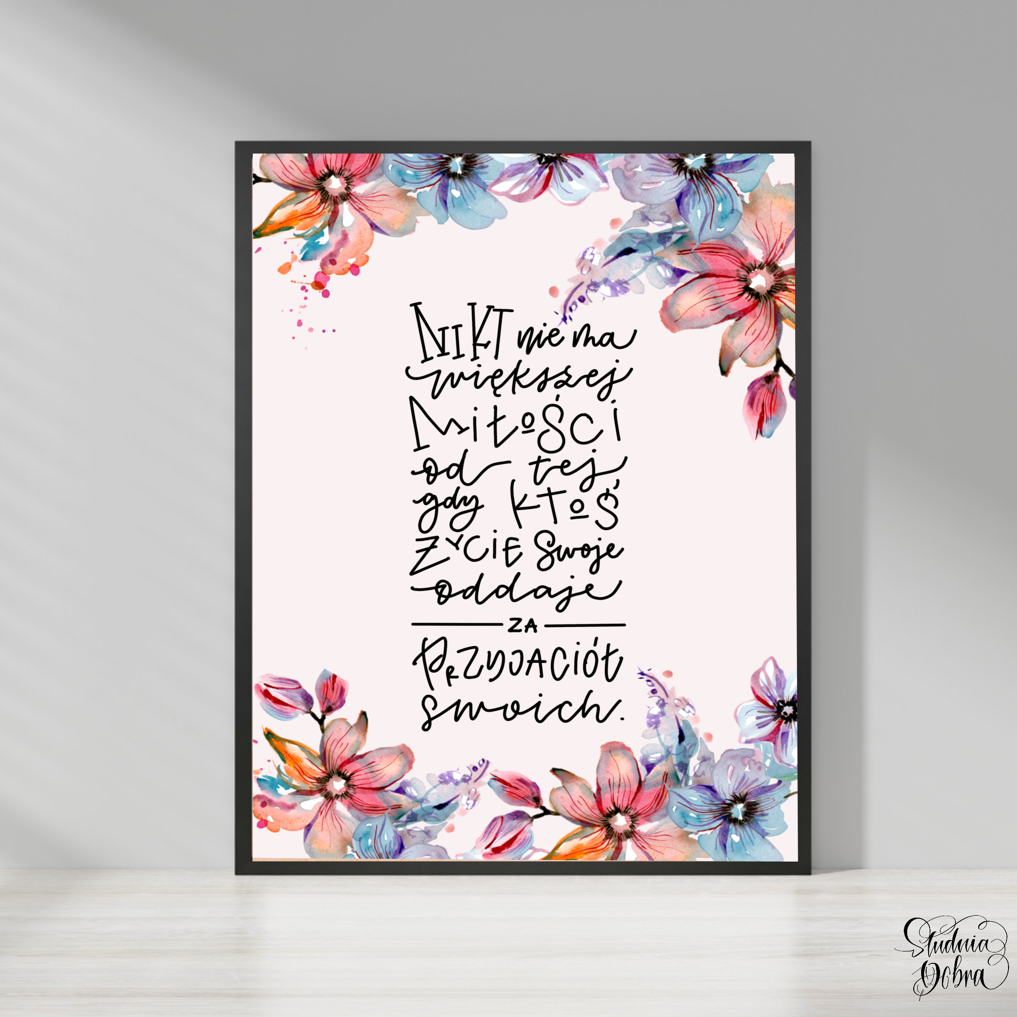 Przedstawia cytat biblijny: "Nikt nie ma większej miłości od tej, gdy ktoś życie dwoje oddaje za przyjaciół swoich", napisany w ozdobnej, nowoczesnej formie.