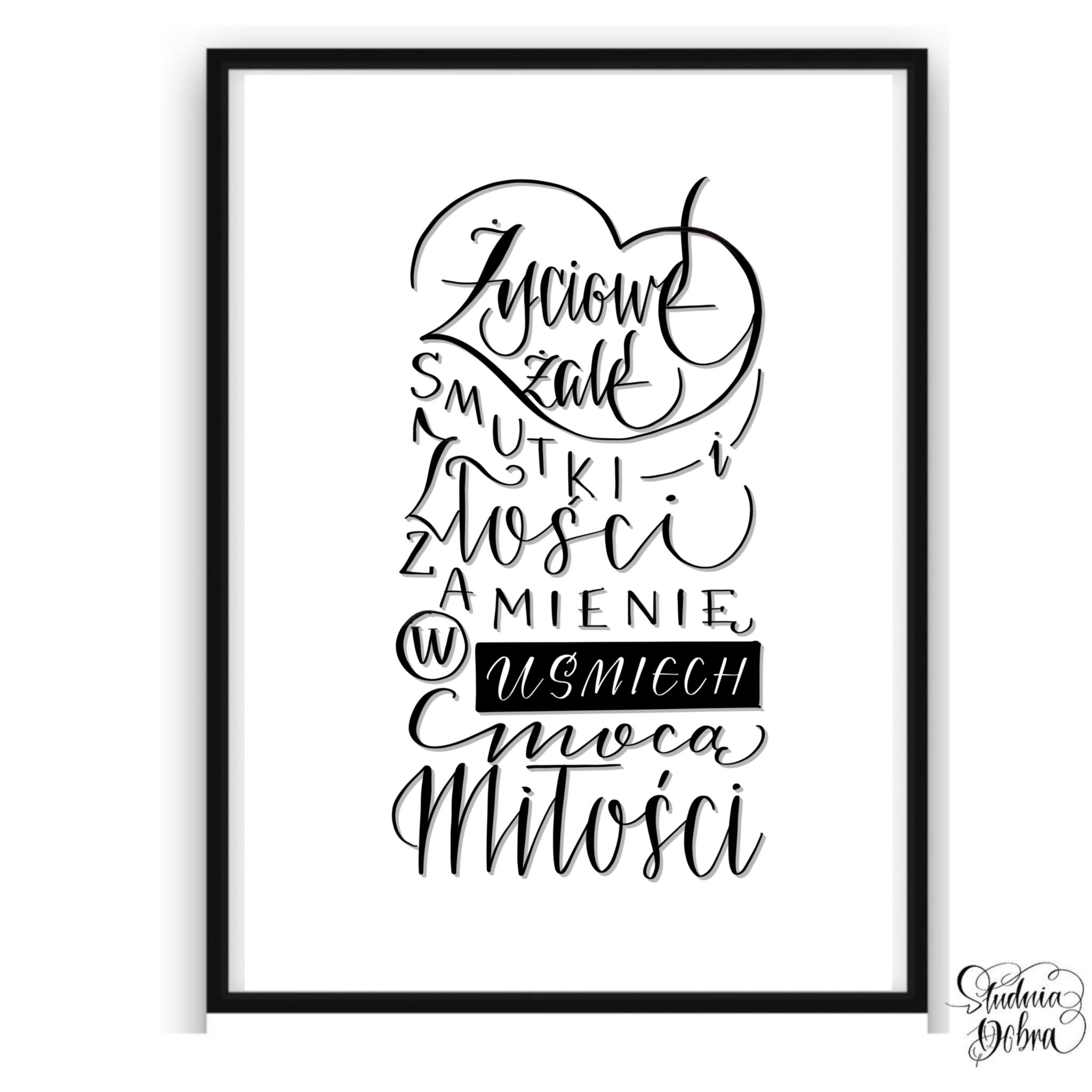 Idealny jako prezent na rózne okazje. Zawiera autorski cytat: "Życiowe żale, smutki i złości zamienię w uśmiech mocą miłości". Napisane ozdobnym pismem.
